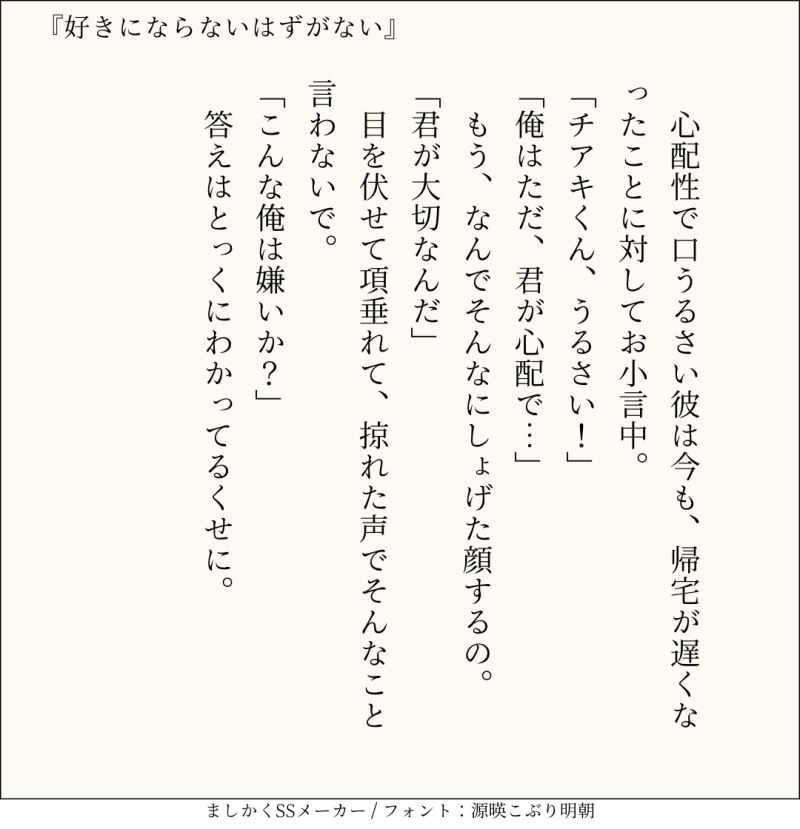 句読点込みで140文字ぴったりに仕上げるのがマイルール。140文字で書くお題ったー(shindanmaker.com/375517)で書いたSS等、短文置き場