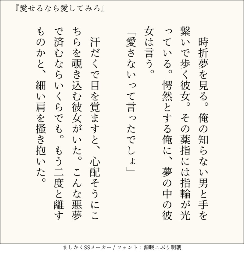 句読点込みで140文字ぴったりに仕上げるのがマイルール。140文字で書くお題ったー(shindanmaker.com/375517)で書いたSS等、短文置き場
