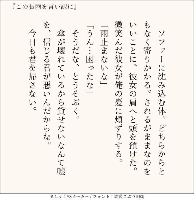 句読点込みで140文字ぴったりに仕上げるのがマイルール。140文字で書くお題ったー(shindanmaker.com/375517)で書いたSS等、短文置き場