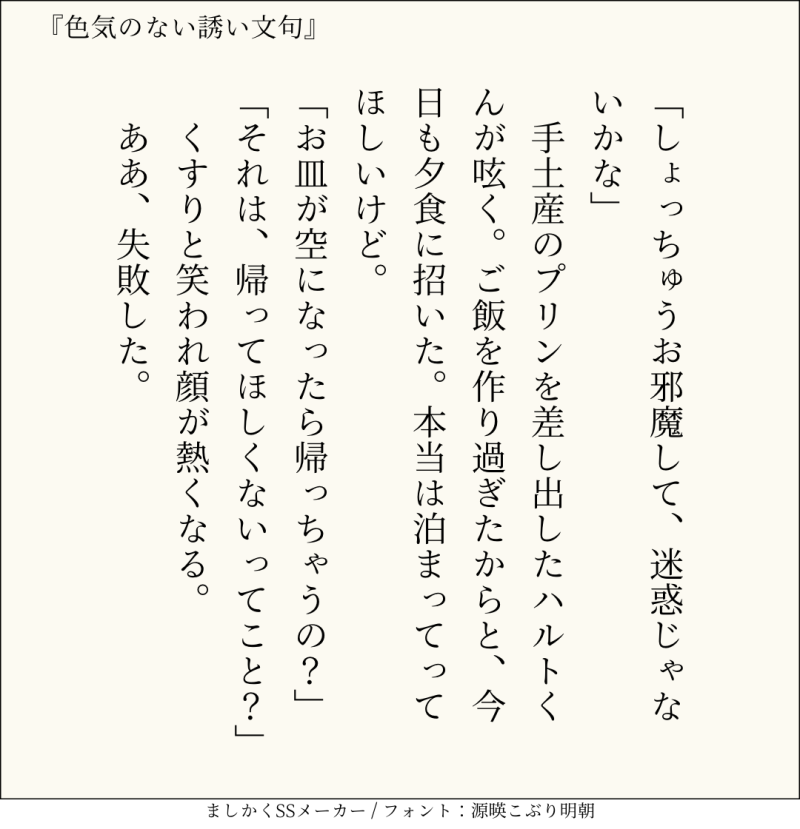 句読点込みで140文字ぴったりに仕上げるのがマイルール。140文字で書くお題ったー(shindanmaker.com/375517)で書いたSS等、短文置き場