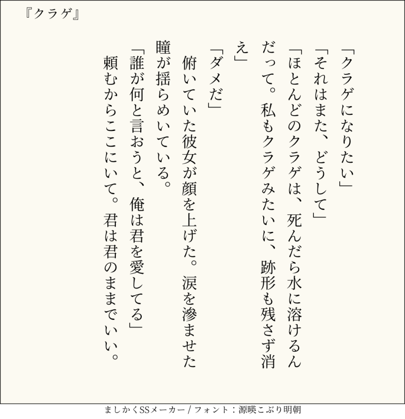 句読点込みで140文字ぴったりに仕上げるのがマイルール。140文字で書くお題ったー(shindanmaker.com/375517)で書いたSS等、短文置き場