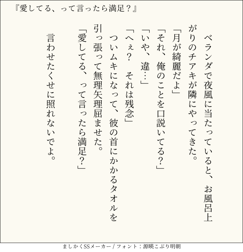 貴方はチア相で『愛してる、って言ったら満足?』をお題にして140文字SSを書いてください。