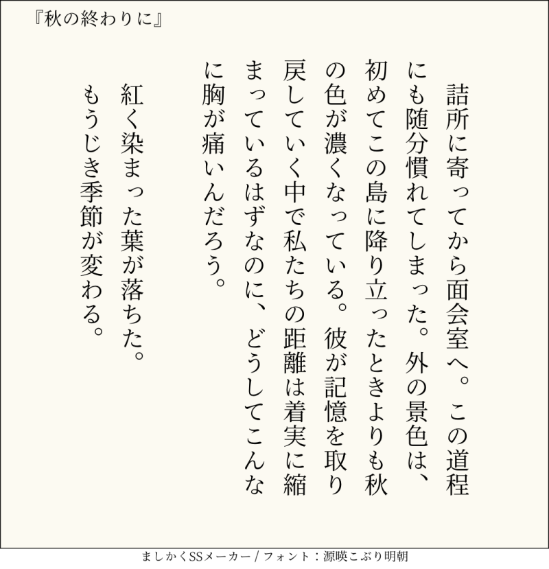 句読点込みで140文字ぴったりに仕上げるのがマイルール。140文字で書くお題ったー(shindanmaker.com/375517)で書いたSS等、短文置き場