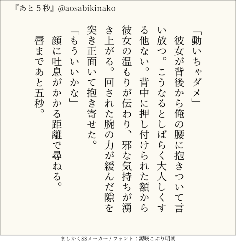 句読点込みで140文字ぴったりに仕上げるのがマイルール。140文字で書くお題ったー(shindanmaker.com/375517)で書いたSS等、短文置き場