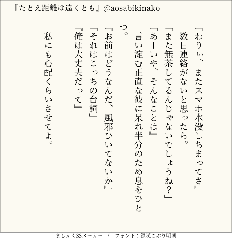 句読点込みで140文字ぴったりに仕上げるのがマイルール。140文字で書くお題ったー(shindanmaker.com/375517)で書いたSS等、短文置き場