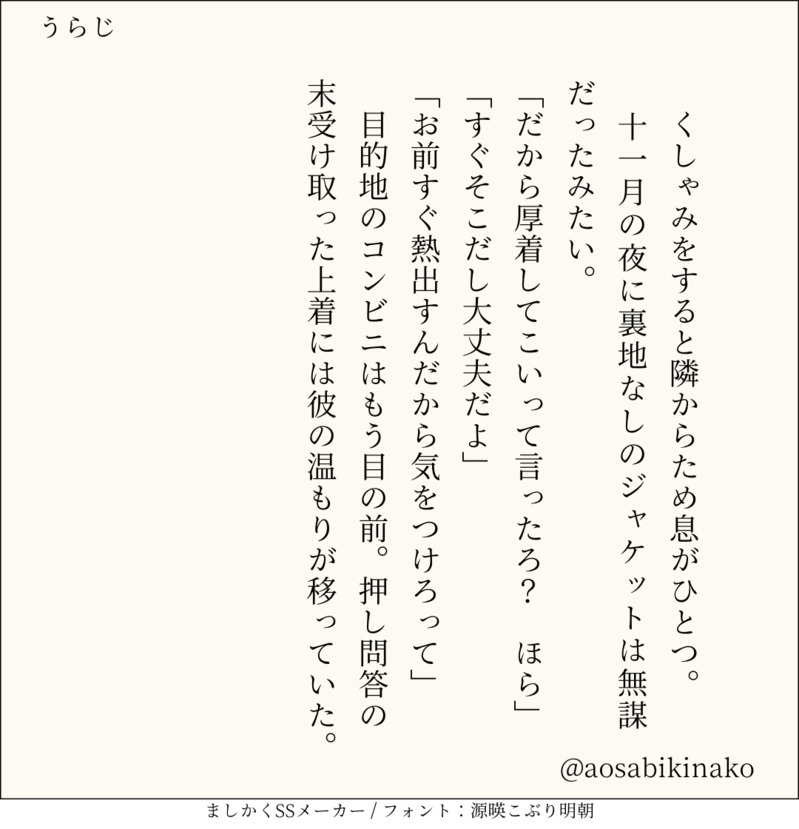 句読点込みで140文字ぴったりに仕上げるのがマイルール。140文字で書くお題ったー(shindanmaker.com/375517)で書いたSS等、短文置き場