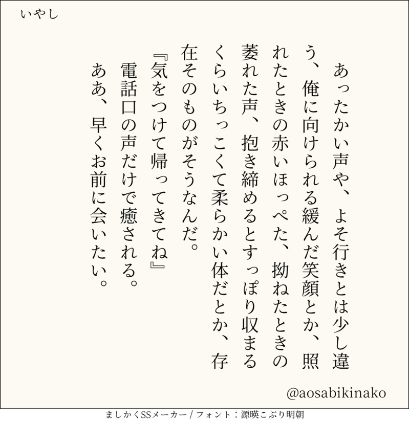 句読点込みで140文字ぴったりに仕上げるのがマイルール。140文字で書くお題ったー(shindanmaker.com/375517)で書いたSS等、短文置き場