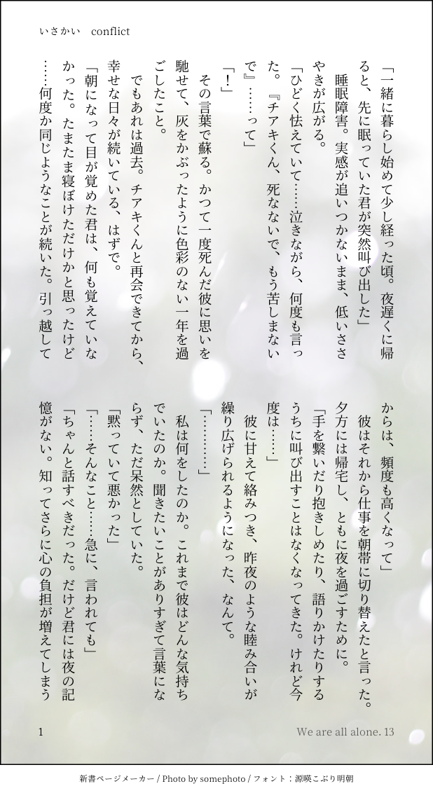 mikku_mikua☆quiet followSPOILER第13話 いさかいチアキ×相談員の不定期連載です。⚠️チアキくんED3のネタバレあり⚠️捏造と自己解釈もりもり⚠️暗いある病気の話が出てきます。 #チア相 cheerleadingPhase show all(+2 images) Tap to full screen (size:618x1132).Repost is prohibited Let's send reactions! freqpopularsnackothersPayment processing Replies from the creator Follow creator you care about!☆quiet follow mikku_mikuaSPOILER【完結】第22話 しゃしんやチアキ×相談員の不定期連載、これで一区切りです。見て下さりありがとうございました!⚠️ED3のネタバレありこのお話を含めたチア相エンド3まとめ小説本を出します。詳細はまだ仮ですが、よろしければ覗いていってもらえると嬉しいです。https://reticenteris.booth.pm/items/4260884 2 mikku_mikuaSPOILER第21話 ろめんでんしゃチアキ×相談員の不定期連載です。⚠️ED3のネタバレあり⚠️暗め 4 mikku_mikuaSPOILER第20話 きいろチアキ×相談員の不定期連載です。⚠️ED3のネタバレあり⚠️暗め 5 mikku_mikuaSPOILER第19話 主導権争いチアキ×相談員の不定期連載です。⚠️ED3のネタバレあり⚠️暗め・アングラ 3 mikku_mikuaSPOILER第18話 くべつチアキ×相談員の不定期連載です。⚠️ED3のネタバレあり⚠️恋愛遍歴フォンネタバレあり⚠️気分のいいものではないです 4 mikku_mikuaSPOILER第17話 ぎんぱくチアキ×相談員の不定期連載です。⚠️ED3のネタバレあり⚠️チアキくんが出ない…好き勝手書いてます 3 related works utiMOURNING友達期間のどこかの供養。なんか恥ずかしみが強くてあまり見返せていない。。https://privatter.net/u/utieet kara_7250PASTチア誕2020(相談員さんいます・肌色注意) 13 kara_7250PASTチア相SSまとめ(初書きから2020年内) 70 utiDONE七夕のチア相。画像のはほのぼのエンドで、ツイートのほうにヤンデレエンドがあります。アンケートで分岐した。https://twitter.com/utieet/status/1147793777626533890?s=20 4 utiDONE梅雨のチア相。何かにつけてプレゼント送ってくれ~! 4 mikku_mikuaSPOILER第15話 夜想曲チアキ×相談員の不定期連載です。⚠️チアキくんED3のネタバレあり⚠️捏造と自己解釈もりもり⚠️仄暗い 5 kara_7250PASTチア相4コマ(かっこいいチアキさんはいません・相談員さんいます) 8 kara_7250PAST⚠︎相談員さんいます⚠︎チア相、ハル相⚠︎R18 7 utiTIRED漫画みたいなのを描いてみたかった。チアキくんの顔はうまい人の下書きを真似したのでちょっとかっこいいw