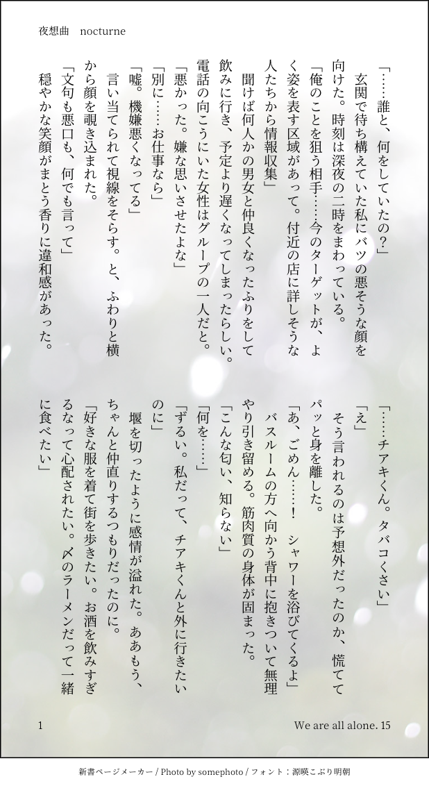 mikku_mikua☆quiet followSPOILER第15話 夜想曲チアキ×相談員の不定期連載です。⚠️チアキくんED3のネタバレあり⚠️捏造と自己解釈もりもり⚠️仄暗い #チア相 cheerleadingPhase show all(+4 images) Tap to full screen (size:618x1132).Repost is prohibited Let's send reactions! freqpopularsnackothersPayment processing Replies from the creator Follow creator you care about!☆quiet follow mikku_mikuaSPOILER【完結】第22話 しゃしんやチアキ×相談員の不定期連載、これで一区切りです。見て下さりありがとうございました!⚠️ED3のネタバレありこのお話を含めたチア相エンド3まとめ小説本を出します。詳細はまだ仮ですが、よろしければ覗いていってもらえると嬉しいです。https://reticenteris.booth.pm/items/4260884 2 mikku_mikuaSPOILER第21話 ろめんでんしゃチアキ×相談員の不定期連載です。⚠️ED3のネタバレあり⚠️暗め 4 mikku_mikuaSPOILER第20話 きいろチアキ×相談員の不定期連載です。⚠️ED3のネタバレあり⚠️暗め 5 mikku_mikuaSPOILER第19話 主導権争いチアキ×相談員の不定期連載です。⚠️ED3のネタバレあり⚠️暗め・アングラ 3 mikku_mikuaSPOILER第18話 くべつチアキ×相談員の不定期連載です。⚠️ED3のネタバレあり⚠️恋愛遍歴フォンネタバレあり⚠️気分のいいものではないです 4 mikku_mikuaSPOILER第17話 ぎんぱくチアキ×相談員の不定期連載です。⚠️ED3のネタバレあり⚠️チアキくんが出ない…好き勝手書いてます 3 related works mikku_mikuaSPOILER第15話 夜想曲チアキ×相談員の不定期連載です。⚠️チアキくんED3のネタバレあり⚠️捏造と自己解釈もりもり⚠️仄暗い 5 utiDONE七夕のチア相。画像のはほのぼのエンドで、ツイートのほうにヤンデレエンドがあります。アンケートで分岐した。https://twitter.com/utieet/status/1147793777626533890?s=20 4 kara_7250PASTチア相4コマ(かっこいいチアキさんはいません・相談員さんいます) 8 utiMOURNING友達期間のどこかの供養。なんか恥ずかしみが強くてあまり見返せていない。。https://privatter.net/u/utieet kara_7250PAST⚠︎相談員さんいます⚠︎チア相、ハル相⚠︎R18 7 utiDONE梅雨のチア相。何かにつけてプレゼント送ってくれ~! 4 kara_7250PASTチア誕2020(相談員さんいます・肌色注意) 13 kara_7250PASTチア相SSまとめ(初書きから2020年内) 70 utiTIRED漫画みたいなのを描いてみたかった。チアキくんの顔はうまい人の下書きを真似したのでちょっとかっこいいw recommended works utiTIRED漫画みたいなのを描いてみたかった。チアキくんの顔はうまい人の下書きを真似したのでちょっとかっこいいw utiDONE秋のネットアンソロ。読書の秋。https://twitter.com/utieet/status/1187902544187555840?s=20 2 utiDONE七夕のチア相。画像のはほのぼのエンドで、ツイートのほうにヤンデレエンドがあります。アンケートで分岐した。https://twitter.com/utieet/status/1147793777626533890?s=20 4 kara_7250PASTハルトアオイチアキまとめ(相談員さんと肌色注意2020年1〜6月) 55 kara_7250PASTチア相SSまとめ(初書きから2020年内) 70 ごん鱈DOODLEチア相ハグ mikku_mikuaSPOILER第1話 ニット帽チアキ×相談員の不定期連載です。⚠️チアキくんED3のネタバレあり⚠️捏造と自己解釈もりもり⚠️仄暗め 3 mikku_mikuaSPOILER第2話 裏付けチアキ×相談員の不定期連載です。⚠️チアキくんED3のネタバレあり⚠️捏造と自己解釈もりもり⚠️仄暗め 3 mikku_mikuaSPOILER第3話 地雷/隠された危機チアキ×相談員の不定期連載です。⚠️チアキくんED3のネタバレあり⚠️捏造と自己解釈もりもり⚠️仄暗め 3