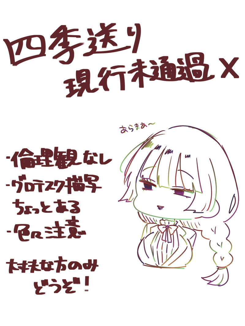 shigurekyouka☆quiet followSPOILER四季送り 現行未通過❌捏造…というか行間埋めSSを書きました注意書きの通りです show all(+9 images) Tap to full screen (size:1536x2048).Repost is prohibited Let's send reactions! freqpopularsnackothersPayment processing Replies from the creator Follow creator you care about!☆quiet follow shigurekyoukaSPOILER四季送り 現行未通過❌捏造…というか行間埋めSSを書きました注意書きの通りです 10 shigurekyoukaSPOILER不辜のサァカス ナイフノモツレ 現行未通過❌弊HO2ナジュムのイメソンパロ絵曲まとめふせ→https://fse.tw/zObGN6XJ(リンク載せきれなくなったため曲リンクはふせったーに移しました) 5 shigurekyoukaSPOILERとある幸せな家族の話 現行未通過❌セッション後に話してたifのやつ…めっちゃらくがきですくるしい くるしいよ〜…… shigurekyoukaDOODLE立てば芍薬座れば牡丹歩く姿は髑髏 現行未通過❌いただいたお嬢のイメソンが本当に嬉しくて…色塗りとかはまだしっかりできてないんですが一旦出します……😭※曲パロトレス shigurekyoukaSPOILERFRaTRlCiDE 現行未通過❌ HO2秘匿持ちは⭕️ちょっと秘匿に抵触するかな〜という補足 なんか描いたらまた増やします 3 shigurekyoukaSPOILERカノヨ街 現行未通過❌めちゃくちゃらくがきだけどネタバレが含まれるのでぽいぴくに格納します… recommended works pompomniumSPOILERPHMのふたりロッキーとグレース ki00yo00koDOODLE未来アズイルの日常の一コマ?優しい目で見てほしい 4 CafFeineDOODLE 7014 みりんかんDONE可愛いと信じる RAPE_0205SPOILERレプ葬オリジナルシーン⚠️ネタバレ未通過と通過中❌ 6 metorichaaanINFO『ホテルアンデルセンへようこそ』𝗞𝗣:𝗔𝗻𝘆 𝗣𝗟:鬼殺し、目鳥、ステラ、ぬゐめ、りばーむ、あおば (𝗛𝗢順・敬称略)𝟰生還𝟮ロスト 2 右巻きかたつむりPROGRESSぽっちゃりカントボーイアルカードちゃん続き あかかMOURNINGアイコンにしてるメイちゃん出しとくねー Yasunari_imoINFO❚ CoC 「桐と枸櫞」(敬称略) KP/KPC:如月❄️/五十嵐 一誠 PL/PC:安納/葛城 玄彌