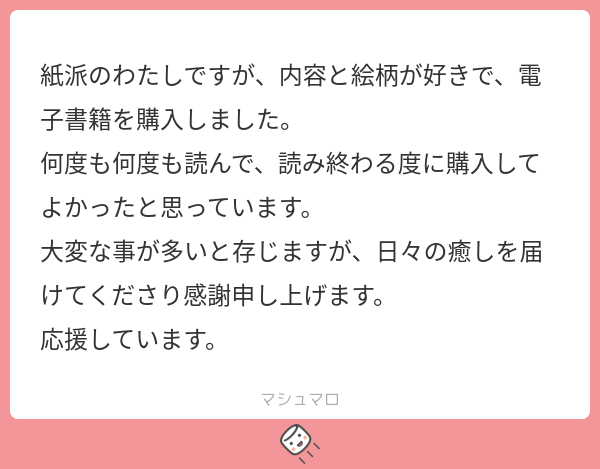 RABdesu☆quiet followINFO私も紙派なので電子購入は腰が重いのわかります。それにも関わらず買ってくださりありがとうございます私の作品を支えてくれる人に、癒しをお返しする事ができて嬉しいです色々感謝の言葉を考えましたが、この想いに尽きます #マシュマロ marshmallow Tap to full screen (size:600x469).Repost is prohibited Let's send reactions! freqpopularsnackothersPayment processing Replies from the creator Follow creator you care about!☆quiet follow RABdesuINFOあります……とても可愛いです RABdesuINFOありがとうございます…><!下記、現状公開できる情報です。難波 凛太郎(なんばりんたろう)30歳A型190㎝誕生日:4/23色:群青髪/青目職業:カフェオーナー山田 ルナ(やまだるな)25歳B型155㎝誕生日:12/1色:金髪/緑目職業:エステティシャン RABdesuINFO栄養があってよかったです…><巡り合えたご縁に感謝します、また読んでくれてありがとうございます!応援も糧になります…!これからも楽しんでいただけるよう精進します RABdesuINFOメッセージありがとうございます!楽しんでもらえて嬉しいです、伝えてくれて ありがとうございますとても素敵な日本語です✨ RABdesuINFO受験がんばってください…!そう思っていただけて光栄です><いつか買ってもらえた時に、がんばってよかったと感じてもらえるよう私もがんばります!でも無理はせず、今はお勉強の合間の癒しの一つになれたら幸いです RABdesuINFO現状 一つも紙書籍化している作品はありません💦今後の予定については人気次第で可能性はあります、としか今はお伝え出来ません…精進して参ります! related works 甘味料DOODLE3/14まで置いておくのでマシュマロください RABdesuINFOいろんな見方で向き合って貰えて光栄です…!濁した表現が多いので受け取ってもらえるかいつも不安でありますが、その余白を楽しんでもらえて嬉しいです初めてBL作品を公開したこともありドキドキしましたが前向きなご感想いただけて救われました、ありがとうございます。邁進いたします…! RABdesuINFOTwitterまで見てくださり、ありがとうございます…!今後も見守ってもらえると助かります…;;みんなクセが強いですが、好きになってもらえて光栄です><こちらこそ素敵なメッセージ、とても嬉しいです ありがとうございます! RABdesuINFO購入までありがとうございます;;元気なゼリエル愛、嬉しいです><私もゼリ推してるので同士ですね…ピア様もわずかな落書きだけなのに好いてくれて感無量です正直ゼリエルはクセが強すぎて好かれないと予想していたので驚いています 誰が好かれても嬉しいですが、なんかゼリが好かれてると「お前よかったな~!」って笑ってしまいます😊誕生日までお祝いいただき嬉しいです!お互い穏やかな日々を送りましょう…! RABdesuINFOいつも読んでくださりありがとうございます…!2人の背中から今後まで想像してもらえて嬉しいです!彼らも私も見守っていただいて幸せです後日談はもしかしたら落書きするかも…しれません😊こちらこそ、応援に感謝します…!>< RABdesuINFOすごく面白かったと言って貰えて嬉しいです…!最後まで読んでくださりありがとうございます…!また楽しんでもらえる作品が描けるよう邁進します。見守ってもらえると幸いです RABdesuINFO最後まで読んでくださりありがとうございます…!大好きで応援してもらえる、最高の言葉です>< 素敵な応援メッセージに感謝します…! RABdesuINFO第一話と見比べられるような終わり方にしたので、意図を読み取ってくれて嬉しいです…!ずっとアズキエルたちを見守ってくださり、ありがとうございます…! RABdesuINFO初期からずっと、ありがとうございます…!なにより彼らを好きになってもらえた事がうれしいです、見守ってくださり感謝します…!これからはXにて小ネタをたまにあげると思うので、見てもらえると幸いです><また楽しんでもらえるよう、邁進します…!