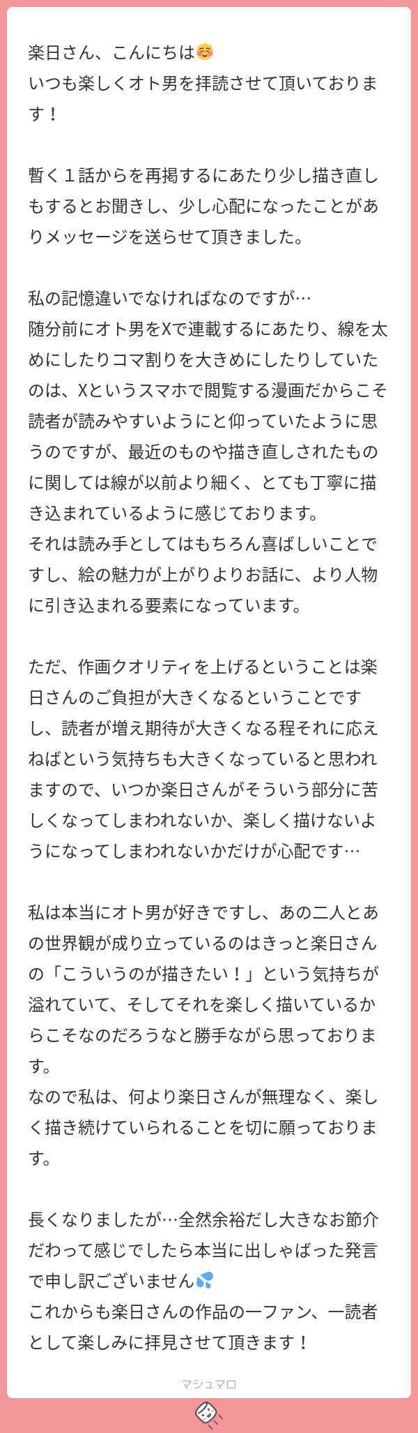 ただ、私にとって作品を公開するというのは様々な"ドキドキ"を抱えるもので、あなたのように「作品は無から生まれるわけじゃない」を理解してる方がいるのは非常に心強いです