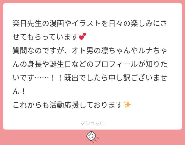 RABdesu☆quiet followINFOありがとうございます…><!下記、現状公開できる情報です。難波 凛太郎(なんばりんたろう)30歳A型190㎝誕生日:4/23色:群青髪/青目職業:カフェオーナー山田 ルナ(やまだるな)25歳B型155㎝誕生日:12/1色:金髪/緑目職業:エステティシャン #マシュマロ marshmallow Tap to full screen (size:600x469).Repost is prohibited Let's send reactions! freqpopularsnackothersPayment processing Replies from the creator Follow creator you care about!☆quiet follow RABdesuINFOあります……とても可愛いです RABdesuINFOありがとうございます…><!下記、現状公開できる情報です。難波 凛太郎(なんばりんたろう)30歳A型190㎝誕生日:4/23色:群青髪/青目職業:カフェオーナー山田 ルナ(やまだるな)25歳B型155㎝誕生日:12/1色:金髪/緑目職業:エステティシャン RABdesuINFO栄養があってよかったです…><巡り合えたご縁に感謝します、また読んでくれてありがとうございます!応援も糧になります…!これからも楽しんでいただけるよう精進します RABdesuINFOメッセージありがとうございます!楽しんでもらえて嬉しいです、伝えてくれて ありがとうございますとても素敵な日本語です✨ RABdesuINFO受験がんばってください…!そう思っていただけて光栄です><いつか買ってもらえた時に、がんばってよかったと感じてもらえるよう私もがんばります!でも無理はせず、今はお勉強の合間の癒しの一つになれたら幸いです RABdesuINFO現状 一つも紙書籍化している作品はありません💦今後の予定については人気次第で可能性はあります、としか今はお伝え出来ません…精進して参ります! related works RABdesuINFO最後まで読んでくださりありがとうございます…!大好きで応援してもらえる、最高の言葉です>< 素敵な応援メッセージに感謝します…! RABdesuINFOいろんな見方で向き合って貰えて光栄です…!濁した表現が多いので受け取ってもらえるかいつも不安でありますが、その余白を楽しんでもらえて嬉しいです初めてBL作品を公開したこともありドキドキしましたが前向きなご感想いただけて救われました、ありがとうございます。邁進いたします…! RABdesuINFO購入までありがとうございます;;元気なゼリエル愛、嬉しいです><私もゼリ推してるので同士ですね…ピア様もわずかな落書きだけなのに好いてくれて感無量です正直ゼリエルはクセが強すぎて好かれないと予想していたので驚いています 誰が好かれても嬉しいですが、なんかゼリが好かれてると「お前よかったな~!」って笑ってしまいます😊誕生日までお祝いいただき嬉しいです!お互い穏やかな日々を送りましょう…! 甘味料DOODLE3/14まで置いておくのでマシュマロください RABdesuINFO第一話と見比べられるような終わり方にしたので、意図を読み取ってくれて嬉しいです…!ずっとアズキエルたちを見守ってくださり、ありがとうございます…! RABdesuINFOすごく面白かったと言って貰えて嬉しいです…!最後まで読んでくださりありがとうございます…!また楽しんでもらえる作品が描けるよう邁進します。見守ってもらえると幸いです RABdesuINFOいつも読んでくださりありがとうございます…!2人の背中から今後まで想像してもらえて嬉しいです!彼らも私も見守っていただいて幸せです後日談はもしかしたら落書きするかも…しれません😊こちらこそ、応援に感謝します…!>< RABdesuINFO初期からずっと、ありがとうございます…!なにより彼らを好きになってもらえた事がうれしいです、見守ってくださり感謝します…!これからはXにて小ネタをたまにあげると思うので、見てもらえると幸いです><また楽しんでもらえるよう、邁進します…! RABdesuINFOTwitterまで見てくださり、ありがとうございます…!今後も見守ってもらえると助かります…;;みんなクセが強いですが、好きになってもらえて光栄です><こちらこそ素敵なメッセージ、とても嬉しいです ありがとうございます!