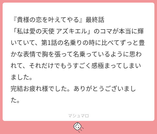 RABdesu☆quiet followINFO第一話と見比べられるような終わり方にしたので、意図を読み取ってくれて嬉しいです…!ずっとアズキエルたちを見守ってくださり、ありがとうございます…! #マシュマロ marshmallow Tap to full screen (size:600x513).Repost is prohibited Let's send reactions! freqpopularsnackothersPayment processing Replies from the creator Follow creator you care about!☆quiet follow RABdesuINFOあります……とても可愛いです RABdesuINFOありがとうございます…><!下記、現状公開できる情報です。難波 凛太郎(なんばりんたろう)30歳A型190㎝誕生日:4/23色:群青髪/青目職業:カフェオーナー山田 ルナ(やまだるな)25歳B型155㎝誕生日:12/1色:金髪/緑目職業:エステティシャン RABdesuINFO栄養があってよかったです…><巡り合えたご縁に感謝します、また読んでくれてありがとうございます!応援も糧になります…!これからも楽しんでいただけるよう精進します RABdesuINFOメッセージありがとうございます!楽しんでもらえて嬉しいです、伝えてくれて ありがとうございますとても素敵な日本語です✨ RABdesuINFO受験がんばってください…!そう思っていただけて光栄です><いつか買ってもらえた時に、がんばってよかったと感じてもらえるよう私もがんばります!でも無理はせず、今はお勉強の合間の癒しの一つになれたら幸いです RABdesuINFO現状 一つも紙書籍化している作品はありません💦今後の予定については人気次第で可能性はあります、としか今はお伝え出来ません…精進して参ります! related works RABdesuINFO第一話と見比べられるような終わり方にしたので、意図を読み取ってくれて嬉しいです…!ずっとアズキエルたちを見守ってくださり、ありがとうございます…! RABdesuINFOすごく面白かったと言って貰えて嬉しいです…!最後まで読んでくださりありがとうございます…!また楽しんでもらえる作品が描けるよう邁進します。見守ってもらえると幸いです RABdesuINFO購入までありがとうございます;;元気なゼリエル愛、嬉しいです><私もゼリ推してるので同士ですね…ピア様もわずかな落書きだけなのに好いてくれて感無量です正直ゼリエルはクセが強すぎて好かれないと予想していたので驚いています 誰が好かれても嬉しいですが、なんかゼリが好かれてると「お前よかったな~!」って笑ってしまいます😊誕生日までお祝いいただき嬉しいです!お互い穏やかな日々を送りましょう…! RABdesuINFO最後まで読んでくださりありがとうございます…!大好きで応援してもらえる、最高の言葉です>< 素敵な応援メッセージに感謝します…! RABdesuINFOいつも読んでくださりありがとうございます…!2人の背中から今後まで想像してもらえて嬉しいです!彼らも私も見守っていただいて幸せです後日談はもしかしたら落書きするかも…しれません😊こちらこそ、応援に感謝します…!>< RABdesuINFOいろんな見方で向き合って貰えて光栄です…!濁した表現が多いので受け取ってもらえるかいつも不安でありますが、その余白を楽しんでもらえて嬉しいです初めてBL作品を公開したこともありドキドキしましたが前向きなご感想いただけて救われました、ありがとうございます。邁進いたします…! 甘味料DOODLE3/14まで置いておくのでマシュマロください RABdesuINFOTwitterまで見てくださり、ありがとうございます…!今後も見守ってもらえると助かります…;;みんなクセが強いですが、好きになってもらえて光栄です><こちらこそ素敵なメッセージ、とても嬉しいです ありがとうございます! RABdesuINFO初期からずっと、ありがとうございます…!なにより彼らを好きになってもらえた事がうれしいです、見守ってくださり感謝します…!これからはXにて小ネタをたまにあげると思うので、見てもらえると幸いです><また楽しんでもらえるよう、邁進します…!