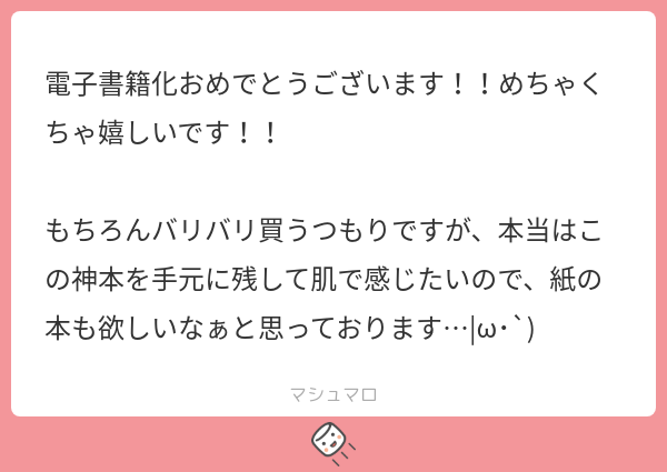 RABdesu☆quiet followINFOお祝いと喜びの声、ありがとうございます…!購入も検討いただき恐縮です、感謝します;;紙書籍についてはご用意できず申し訳ありません、紙も出版できるよう引き続きがんばります><その為にも皆さまの応援が本当に力になります。共に形にできたら幸いです…! #マシュマロ marshmallow Tap to full screen (size:600x425).Repost is prohibited Let's send reactions! freqpopularsnackothersPayment processing Replies from the creator Follow creator you care about!☆quiet follow RABdesuINFOあります……とても可愛いです RABdesuINFOありがとうございます…><!下記、現状公開できる情報です。難波 凛太郎(なんばりんたろう)30歳A型190㎝誕生日:4/23色:群青髪/青目職業:カフェオーナー山田 ルナ(やまだるな)25歳B型155㎝誕生日:12/1色:金髪/緑目職業:エステティシャン RABdesuINFO栄養があってよかったです…><巡り合えたご縁に感謝します、また読んでくれてありがとうございます!応援も糧になります…!これからも楽しんでいただけるよう精進します RABdesuINFOメッセージありがとうございます!楽しんでもらえて嬉しいです、伝えてくれて ありがとうございますとても素敵な日本語です✨ RABdesuINFO受験がんばってください…!そう思っていただけて光栄です><いつか買ってもらえた時に、がんばってよかったと感じてもらえるよう私もがんばります!でも無理はせず、今はお勉強の合間の癒しの一つになれたら幸いです RABdesuINFO現状 一つも紙書籍化している作品はありません💦今後の予定については人気次第で可能性はあります、としか今はお伝え出来ません…精進して参ります! related works RABdesuINFOすごく面白かったと言って貰えて嬉しいです…!最後まで読んでくださりありがとうございます…!また楽しんでもらえる作品が描けるよう邁進します。見守ってもらえると幸いです RABdesuINFOTwitterまで見てくださり、ありがとうございます…!今後も見守ってもらえると助かります…;;みんなクセが強いですが、好きになってもらえて光栄です><こちらこそ素敵なメッセージ、とても嬉しいです ありがとうございます! RABdesuINFO購入までありがとうございます;;元気なゼリエル愛、嬉しいです><私もゼリ推してるので同士ですね…ピア様もわずかな落書きだけなのに好いてくれて感無量です正直ゼリエルはクセが強すぎて好かれないと予想していたので驚いています 誰が好かれても嬉しいですが、なんかゼリが好かれてると「お前よかったな~!」って笑ってしまいます😊誕生日までお祝いいただき嬉しいです!お互い穏やかな日々を送りましょう…! 甘味料DOODLE3/14まで置いておくのでマシュマロください RABdesuINFO初期からずっと、ありがとうございます…!なにより彼らを好きになってもらえた事がうれしいです、見守ってくださり感謝します…!これからはXにて小ネタをたまにあげると思うので、見てもらえると幸いです><また楽しんでもらえるよう、邁進します…! RABdesuINFOいつも読んでくださりありがとうございます…!2人の背中から今後まで想像してもらえて嬉しいです!彼らも私も見守っていただいて幸せです後日談はもしかしたら落書きするかも…しれません😊こちらこそ、応援に感謝します…!>< RABdesuINFO第一話と見比べられるような終わり方にしたので、意図を読み取ってくれて嬉しいです…!ずっとアズキエルたちを見守ってくださり、ありがとうございます…! RABdesuINFO最後まで読んでくださりありがとうございます…!大好きで応援してもらえる、最高の言葉です>< 素敵な応援メッセージに感謝します…! RABdesuINFOいろんな見方で向き合って貰えて光栄です…!濁した表現が多いので受け取ってもらえるかいつも不安でありますが、その余白を楽しんでもらえて嬉しいです初めてBL作品を公開したこともありドキドキしましたが前向きなご感想いただけて救われました、ありがとうございます。邁進いたします…! recommended works 甘味料DOODLE3/14まで置いておくのでマシュマロください fjmrskMEMOTwitterだと画質が落ちたのでこっちにもあげときます。(計4枚) 4 h‘|ッЛDONE【しん風】でホワイトデー?です!いや、完全に自分のせいなんですが、snkzちゃん達にバレンタインもホワイトデーもできなくてですねぇ…😫snkzちゃん達ケンカになってしまいました。まじで面目ない…😭ちなみにハンカチ・・・手巾(てぎれ)から、手切れと、ホワイトデーにはふさわしくないですwマシュマロ・・・嫌い(諸説あり)という意味があります🙄 2 ぽめたDOODLEつかあま差分も 2 ボンリネMOURNINGマシュマロが食べたいくろさわくろさわがマシュマロを食べたいようです。また様子がおかしくなりました 3 RABdesuINFO最高の褒め言葉をありがとうございます…!気晴らしに描いているお話ですが、こうして奇跡的に楽しんでくれてる人がいると実感するとまた次も描こうかなと思えてきます☺️お心遣いも痛み入ります。貴方の毎日も素敵になりますように…! makot_shinDONE【アキイト】🔦さんの誕生日に間に合いませんでした。誕生日と