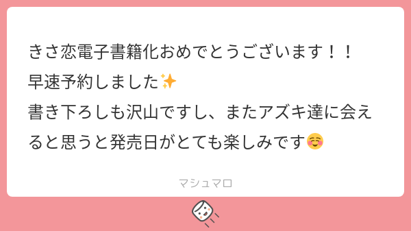 RABdesu☆quiet followINFO早速予約いただきとても嬉しいです…!ありがとうございます;;私もみなさまにまた物語をお届けできることが楽しみです、受け取ってくださりありがとうございます…! #マシュマロ marshmallow Tap to full screen (size:600x337).Repost is prohibited Let's send reactions! freqpopularsnackothersPayment processing Replies from the creator Follow creator you care about!☆quiet follow RABdesuINFOあります……とても可愛いです RABdesuINFOありがとうございます…><!下記、現状公開できる情報です。難波 凛太郎(なんばりんたろう)30歳A型190㎝誕生日:4/23色:群青髪/青目職業:カフェオーナー山田 ルナ(やまだるな)25歳B型155㎝誕生日:12/1色:金髪/緑目職業:エステティシャン RABdesuINFO栄養があってよかったです…><巡り合えたご縁に感謝します、また読んでくれてありがとうございます!応援も糧になります…!これからも楽しんでいただけるよう精進します RABdesuINFOメッセージありがとうございます!楽しんでもらえて嬉しいです、伝えてくれて ありがとうございますとても素敵な日本語です✨ RABdesuINFO受験がんばってください…!そう思っていただけて光栄です><いつか買ってもらえた時に、がんばってよかったと感じてもらえるよう私もがんばります!でも無理はせず、今はお勉強の合間の癒しの一つになれたら幸いです RABdesuINFO現状 一つも紙書籍化している作品はありません💦今後の予定については人気次第で可能性はあります、としか今はお伝え出来ません…精進して参ります! related works 甘味料DOODLE3/14まで置いておくのでマシュマロください RABdesuINFOいろんな見方で向き合って貰えて光栄です…!濁した表現が多いので受け取ってもらえるかいつも不安でありますが、その余白を楽しんでもらえて嬉しいです初めてBL作品を公開したこともありドキドキしましたが前向きなご感想いただけて救われました、ありがとうございます。邁進いたします…! RABdesuINFOすごく面白かったと言って貰えて嬉しいです…!最後まで読んでくださりありがとうございます…!また楽しんでもらえる作品が描けるよう邁進します。見守ってもらえると幸いです RABdesuINFO第一話と見比べられるような終わり方にしたので、意図を読み取ってくれて嬉しいです…!ずっとアズキエルたちを見守ってくださり、ありがとうございます…! RABdesuINFO購入までありがとうございます;;元気なゼリエル愛、嬉しいです><私もゼリ推してるので同士ですね…ピア様もわずかな落書きだけなのに好いてくれて感無量です正直ゼリエルはクセが強すぎて好かれないと予想していたので驚いています 誰が好かれても嬉しいですが、なんかゼリが好かれてると「お前よかったな~!」って笑ってしまいます😊誕生日までお祝いいただき嬉しいです!お互い穏やかな日々を送りましょう…! RABdesuINFO最後まで読んでくださりありがとうございます…!大好きで応援してもらえる、最高の言葉です>< 素敵な応援メッセージに感謝します…! RABdesuINFOTwitterまで見てくださり、ありがとうございます…!今後も見守ってもらえると助かります…;;みんなクセが強いですが、好きになってもらえて光栄です><こちらこそ素敵なメッセージ、とても嬉しいです ありがとうございます! RABdesuINFO初期からずっと、ありがとうございます…!なにより彼らを好きになってもらえた事がうれしいです、見守ってくださり感謝します…!これからはXにて小ネタをたまにあげると思うので、見てもらえると幸いです><また楽しんでもらえるよう、邁進します…! RABdesuINFOいつも読んでくださりありがとうございます…!2人の背中から今後まで想像してもらえて嬉しいです!彼らも私も見守っていただいて幸せです後日談はもしかしたら落書きするかも…しれません😊こちらこそ、応援に感謝します…!><