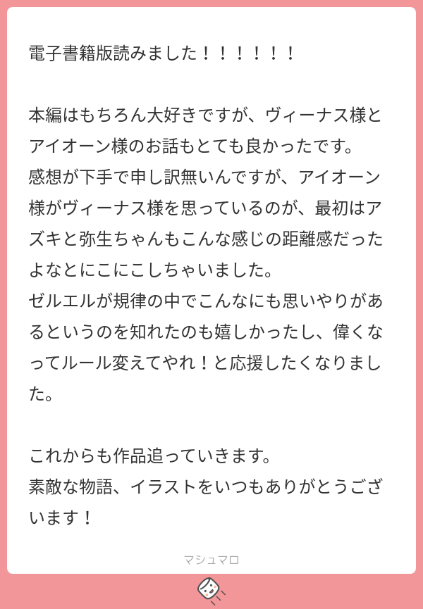 RABdesu☆quiet followINFO購入ありがとうございます。pixivで読めるし正直ほとんど売れないと思っていたので嬉しいです…><楽しんでもらえたなら、ささやかですが描きおろしをつけて本当によかったです 確かに、神のお二人はアズキたちに似ているかもしれませんね…!改めて読んでくださりありがとうございます、心強いです…! #マシュマロ marshmallow Tap to full screen (size:600x865).Repost is prohibited Let's send reactions! freqpopularsnackothersPayment processing Replies from the creator Follow creator you care about!☆quiet follow RABdesuINFOあります……とても可愛いです RABdesuINFOありがとうございます…><!下記、現状公開できる情報です。難波 凛太郎(なんばりんたろう)30歳A型190㎝誕生日:4/23色:群青髪/青目職業:カフェオーナー山田 ルナ(やまだるな)25歳B型155㎝誕生日:12/1色:金髪/緑目職業:エステティシャン RABdesuINFO栄養があってよかったです…><巡り合えたご縁に感謝します、また読んでくれてありがとうございます!応援も糧になります…!これからも楽しんでいただけるよう精進します RABdesuINFOメッセージありがとうございます!楽しんでもらえて嬉しいです、伝えてくれて ありがとうございますとても素敵な日本語です✨ RABdesuINFO受験がんばってください…!そう思っていただけて光栄です><いつか買ってもらえた時に、がんばってよかったと感じてもらえるよう私もがんばります!でも無理はせず、今はお勉強の合間の癒しの一つになれたら幸いです RABdesuINFO現状 一つも紙書籍化している作品はありません💦今後の予定については人気次第で可能性はあります、としか今はお伝え出来ません…精進して参ります! related works RABdesuINFOいつも読んでくださりありがとうございます…!2人の背中から今後まで想像してもらえて嬉しいです!彼らも私も見守っていただいて幸せです後日談はもしかしたら落書きするかも…しれません😊こちらこそ、応援に感謝します…!>< RABdesuINFOいろんな見方で向き合って貰えて光栄です…!濁した表現が多いので受け取ってもらえるかいつも不安でありますが、その余白を楽しんでもらえて嬉しいです初めてBL作品を公開したこともありドキドキしましたが前向きなご感想いただけて救われました、ありがとうございます。邁進いたします…! RABdesuINFOTwitterまで見てくださり、ありがとうございます…!今後も見守ってもらえると助かります…;;みんなクセが強いですが、好きになってもらえて光栄です><こちらこそ素敵なメッセージ、とても嬉しいです ありがとうございます! RABdesuINFO購入までありがとうございます;;元気なゼリエル愛、嬉しいです><私もゼリ推してるので同士ですね…ピア様もわずかな落書きだけなのに好いてくれて感無量です正直ゼリエルはクセが強すぎて好かれないと予想していたので驚いています 誰が好かれても嬉しいですが、なんかゼリが好かれてると「お前よかったな~!」って笑ってしまいます😊誕生日までお祝いいただき嬉しいです!お互い穏やかな日々を送りましょう…! RABdesuINFOすごく面白かったと言って貰えて嬉しいです…!最後まで読んでくださりありがとうございます…!また楽しんでもらえる作品が描けるよう邁進します。見守ってもらえると幸いです 甘味料DOODLE3/14まで置いておくのでマシュマロください RABdesuINFO最後まで読んでくださりありがとうございます…!大好きで応援してもらえる、最高の言葉です>< 素敵な応援メッセージに感謝します…! RABdesuINFO第一話と見比べられるような終わり方にしたので、意図を読み取ってくれて嬉しいです…!ずっとアズキエルたちを見守ってくださり、ありがとうございます…! RABdesuINFO初期からずっと、ありがとうございます…!なにより彼らを好きになってもらえた事がうれしいです、見守ってくださり感謝します…!これからはXにて小ネタをたまにあげると思うので、見てもらえると幸いです><また楽しんでもらえるよう、邁進します…!