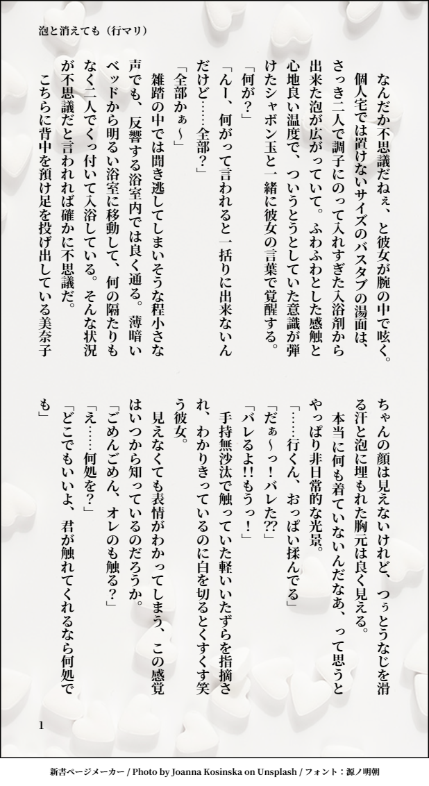 fmh5e☆quiet followDOODLE行マリちゃんがお風呂場でピロートークしてるだけのお話。すけべじゃない。でも服着てないから注意。 show all(+2 images) Tap to full screen (size:618x1132).Repost is prohibited Let's send reactions! freqpopularsnackothersPayment processing Replies from the creator Follow creator you care about!☆quiet follow fmh5eDONE『心を埋める行くんとやのさんのお話(notカップリング)』タイトル通り、行くんとやのさんがお話しているだけ。ふんわり雰囲気友情物としてお読みください。なお、こちらは別作の『正しい女王の育て方』(https://twitter.com/i/events/1546078203604676608?s=20)の行くんパートのifストーリーです。 7258 fmh5eDOODLEすけべもくりで本を作ってみよう!のももお原稿分(落書き)急に終わる。まじで落書き。そのうち続き書きたい。設定は共通なので、注意書き読んでからお読みください。 5261 fmh5eMAIKING※閲覧注意※ひどい要素しかないsanPとftnrになる予定の七本マリの序文だけ置いておく。まだ行くん居ない。親友森とマリィだけ。続き書いたら貼る。PW:半角で行くんのお誕生日4桁 12067 fmh5eDOODLE行マリちゃんがお風呂場でピロートークしてるだけのお話。すけべじゃない。でも服着てないから注意。 3 fmh5eDONEこの度、鍵垢の相互さんと共に非公開「行マリすけべぶっく」を発行いたしました。本の状態にしたものは元々作家陣だけで楽しむ、と言う約束で始めた物なので表に出る事はありませんが、個人原稿は各垢にて発表されるかもしれません。と、言う前置きの下、私のぬるすけべ作品を置き去りにします。 2932 fmh5eDONE!注意!・ftnrマリィ×にょた七・本の地獄みたいな話です。みんなおかしくなってる。・勢いで書いたのでオチも無いしぬるいすけべです。・すけべはファンタジーと納得が出来る人専用です。・誤字脱字ご容赦ください(恥ずかしくて見直し出来ない……) 7042