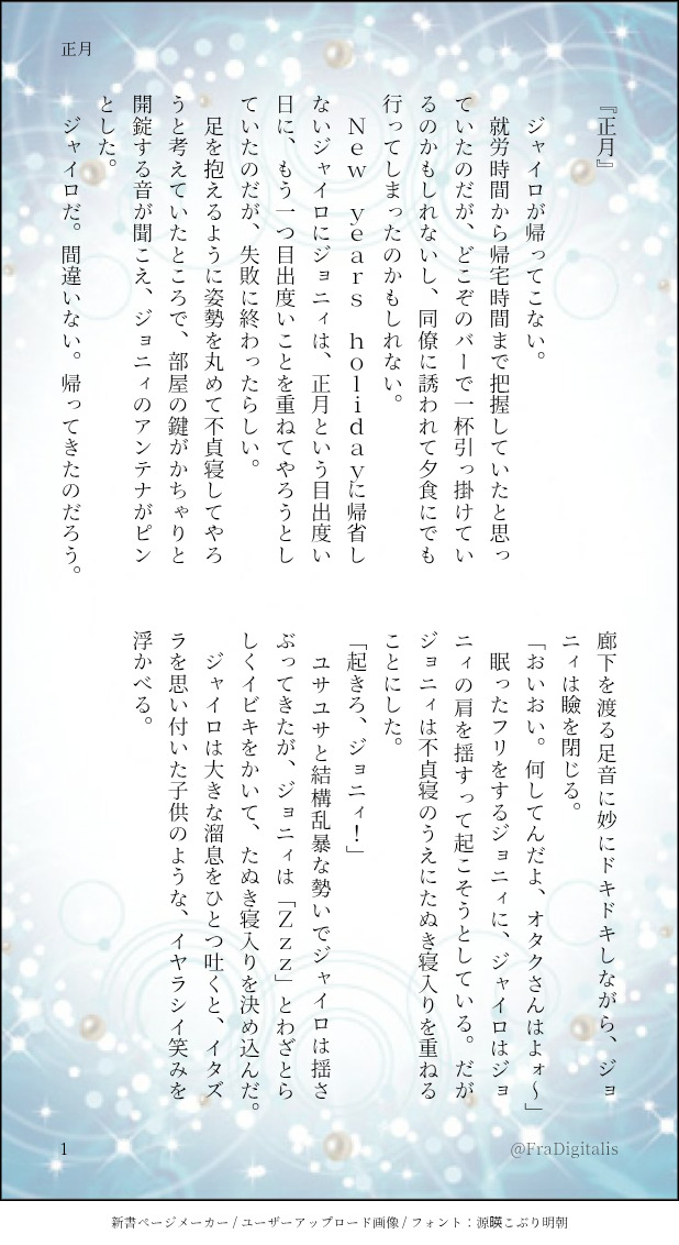 野窓🦊☆quiet followPAST何年か昔のワンライ。お題 正月現パロ #SBR #ジャイジョニ jaijoni. #JOJO腐 show all(+2 images) Tap to full screen (size:618x1132).Repost is prohibited Let's send reactions! freqpopularsnackothersPayment processing Replies from the creator Follow creator you care about!☆quiet follow 野窓🦊PAST何年か昔のワンライ。お題 ピザ。これも気に入っていない。途中経過をすっ飛ばしてるわ、キャラ崩壊など、適当もいいとこだ。 5 野窓🦊PAST何年か昔のワンライ。お題 ピンク 2 野窓🦊PAST何年か昔のワンライ。お題 青いま見ると拙いうえに支離滅裂になってる。微妙に暗いし。気に入ってはいない。 2 野窓🦊PAST何年か昔のワンライ。お題 クリスマス 3 野窓🦊PAST何年か前のワンライ。お題 背中 4 野窓🦊PAST昔のワンライ。お題 バンド 3 related works nukarumiTRAININGグロの練習…難しいいいいいけど楽しかった 4 nukarumiDONEジョニィちゃんの生首虐待!ビターチョコとイチゴソースです! nukarumiDONE⚠gyjoで人外×人間パロ✨挿入はしてないけど絡んでるしjohnnyちゃんが裸なのでポイピクにワンクッションでアップしますね⚠ nukarumiDONE異形化ジョニィちゃん🐙海の悪魔💚 てんは天ぷらが好きDOODLEhttps://twitter.com/ten_dondondon/status/1211497359349145602?s=19 nukarumiDONE貧乳ジョニィ♀ちゃん乳首丸見えなので一応ワンクッション てんは天ぷらが好きDOODLEグラジオラスの花言葉は「勝利」「用心」「密会」。https://twitter.com/ten_dondondon/status/1215285323384537089?s=19 nukarumiDONEラブレターからのリクエストで「バニーガールの衣装を着る女装ジョニィちゃん」です!リクエストありがとうございましたー!!!♡ てんは天ぷらが好きDOODLEスター・リリー。花言葉は「誇り」そして「純粋」https://twitter.com/ten_dondondon/status/1221431824137641985?s=19 recommended works cercaconunamoogMOURNING #ジャイロ #SBR てんは天ぷらが好きDOODLE林檎の花言葉は「選択」そして「後悔」https://twitter.com/ten_dondondon/status/1234814128830599168?s=19 馬糞ちゃんDONEジョナディオ♀のぬるいエロです。ジョナは手しか写ってないです。パスワード…受けの女体化+α巨乳大丈夫?→大丈夫な方は 「yes」でどうぞ! 2 tky_oxoDONE【ジョジョ R18】ホルイル。 6 tky_oxoDONE【ジョジョ R18】ドピリゾ。フォロワさんのツイに便乗。 2 高倉ゆうDOODLEシジョセ落書き。シジョセのえちちをもっと見たいです。 life_dayoDOODLE俳優パロの❄️✨らくがき4コマあまりにもドドドド趣味すぎてこっちに置きます。 2 NewRomanticismDONE NhiHanakoDOODLE🍁☂️⚠️cunt boy