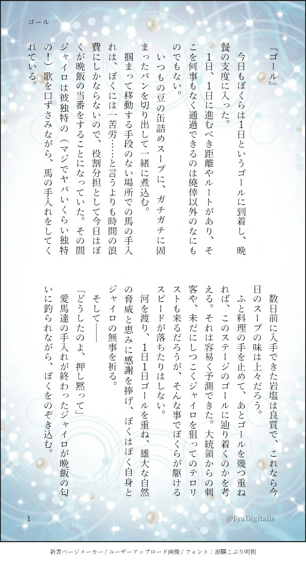 野窓🦊☆quiet followPAST何年か昔のワンライ。お題 ゴール #SBR #ジャイジョニ jaijoni. #JOJO腐 show all(+2 images) Tap to full screen (size:618x1132).Repost is prohibited Let's send reactions! freqpopularsnackothersPayment processing Replies from the creator Follow creator you care about!☆quiet follow 野窓🦊PAST何年か昔のワンライ。お題 ピザ。これも気に入っていない。途中経過をすっ飛ばしてるわ、キャラ崩壊など、適当もいいとこだ。 5 野窓🦊PAST何年か昔のワンライ。お題 ピンク 2 野窓🦊PAST何年か昔のワンライ。お題 青いま見ると拙いうえに支離滅裂になってる。微妙に暗いし。気に入ってはいない。 2 野窓🦊PAST何年か昔のワンライ。お題 クリスマス 3 野窓🦊PAST何年か前のワンライ。お題 背中 4 野窓🦊PAST昔のワンライ。お題 バンド 3 related works nukarumiDONEジョニィちゃんの生首虐待!ビターチョコとイチゴソースです! nukarumiDONEラブレターからのリクエストで「バニーガールの衣装を着る女装ジョニィちゃん」です!リクエストありがとうございましたー!!!♡ nukarumiDONE異形化ジョニィちゃん🐙海の悪魔💚 てんは天ぷらが好きDOODLEグラジオラスの花言葉は「勝利」「用心」「密会」。https://twitter.com/ten_dondondon/status/1215285323384537089?s=19 nukarumiDONE貧乳ジョニィ♀ちゃん乳首丸見えなので一応ワンクッション てんは天ぷらが好きDOODLEhttps://twitter.com/ten_dondondon/status/1211497359349145602?s=19 nukarumiTRAININGグロの練習…難しいいいいいけど楽しかった 4 てんは天ぷらが好きDOODLEスター・リリー。花言葉は「誇り」そして「純粋」https://twitter.com/ten_dondondon/status/1221431824137641985?s=19 nukarumiDONE⚠gyjoで人外×人間パロ✨挿入はしてないけど絡んでるしjohnnyちゃんが裸なのでポイピクにワンクッションでアップしますね⚠ recommended works くらみるMOURNING一枚目はボツ絵、二枚目はただの落書きです。ここ半年くらいジョジョが熱いです。 2 てんは天ぷらが好きDOODLEスター・リリー。花言葉は「誇り」そして「純粋」https://twitter.com/ten_dondondon/status/1221431824137641985?s=19 まひさMOURNING気づいたら書いてたシリーズ。にわか知識と捏造で書いた承露。 5718 tky_oxoDONE【ジョジョ R18】ホルイル。 6 ぽん (°▽°)DONE⚠️女体化注意オルルディ子襲い受け気持ちはいつでも「朗報!オルルディ子ダヨ!」 abeDOODLEぎゃんぐすたロードも酔ったら脱ぐんですかね おじじ🦖DOODLE*ジョナディォ*動画に使った絵。人間としての理性を捨てきれないジョナが、本能のまま暴れるディォにお仕置きするのを見てみたい。ディォに対してだけ本能のまま襲うジョナとか。立場逆転ジョナディォ。 4 おじじ🦖DOODLE*ジョルDI○*動画に使った絵。 4 rinoco46DOODLE海辺の高級ホテルに泊まった仗露🔞パスワード:高校卒業済の18歳以上ですか?(y/n) 3