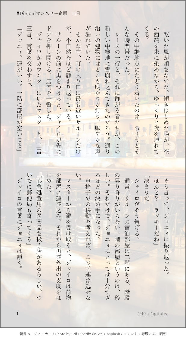 野窓@炭水化物に魂は売った☆quiet followDONE枝(@konnnitihaeda)さんの『#DieJoniマンスリー企画』にコッソリ参加した掌編。Xにも投稿したけれど、一応こっちにもあげておく。……これ、ホットチョコレート=ディエゴという暗喩、伝わってんのかなあ…? #SBR #ディエジョニ dierjoni. #JOJO腐 show all(+6 images) Tap to full screen (size:618x1132).Repost is prohibited Let's send reactions! freqpopularsnackothersPayment processing Replies from the creator Follow creator you care about!☆quiet follow 野窓@炭水化物に魂は売ったDONE昔の掌編を手直し。こんなことやってるから眠れないんだろうなあ。これも『できた』でも『供養』でもなくリメイクが正しいよね。 5 野窓@炭水化物に魂は売ったDONE変な時間に目ぇ覚めたから、昔の掌編を手直し。……これ、『できた』というより、リメイクとかだよなあ。 5 野窓@炭水化物に魂は売ったDONE変な時間に目が覚めて書きました。誰かホットワインいれてくれ。掌編ジャイジョニ。 3 野窓@炭水化物に魂は売ったDONE枝(@konnnitihaeda)さんの『#DieJoniマンスリー企画』にコッソリ参加した掌編。Xにも投稿したけれど、一応こっちにもあげておく。……これ、ホットチョコレート=ディエゴという暗喩、伝わってんのかなあ…? 7 野窓@炭水化物に魂は売ったPAST何年か昔のワンライ。お題 ピザ。これも気に入っていない。途中経過をすっ飛ばしてるわ、キャラ崩壊など、適当もいいとこだ。 5 野窓@炭水化物に魂は売ったPAST何年か昔のワンライ。お題 ピンク 2 related works 野窓@炭水化物に魂は売ったDONE枝(@konnnitihaeda)さんの『#DieJoniマンスリー企画』にコッソリ参加した掌編。Xにも投稿したけれど、一応こっちにもあげておく。……これ、ホットチョコレート=ディエゴという暗喩、伝わってんのかなあ…? 7 recommended works てんは天ぷらが好きDOODLE dpakiraDOODLEニョホホ~ 馬糞ちゃんTRAININGチソチソ練習のため描きました。他意は無いです。ところで🏉部活後のチソチソって汗で蒸れて最高だろうなぁ。臭いとか味とか。 2 まひさMOURNING気づいたら書いてたシリーズ。にわか知識と捏造で書いた承露。 5718 Gross_Boi_IchiDONEModels ripped and rigged by elina002 3 ℯ𝓁PAST🔫🐞 🐞:ちょっと! どういうつもりなんですか!🔫:キスしてくれるまで逃がさねぇぞ〜🐞:……(おずおずと額にキスをする)[12/28/2024] お引越ししました。 2 ℯ𝓁PAST🍓🍊「イれるのはヤダけど……それくらいなら…」みたいなノリで始めた "エッ〇ごっこ"🍊くんは "ソコ" のキモチ良さに気づいてしまった……???不慣れな2人だからこその可愛さ…💚🧡[12/30/2024] お引越ししました。 3 みどりの相田SPOILER※「彁」現行・未通過×考察メモ的なやつ。解釈はご自由に。 さけめっちゃのむDOODLEおめがばsernse(α)×rn(Ω)全然抑制剤効かないタイプのrn子供出来るの分かっててもギリ理性が負けるseさんseさん、rnの⚽️選手としてのこれからとか色々考えてるつもりで子供できないようにしそうだけど、いざrnが目の前でヒート起こしてあんなんなったら全然無理pass→18↑? yes or no 2