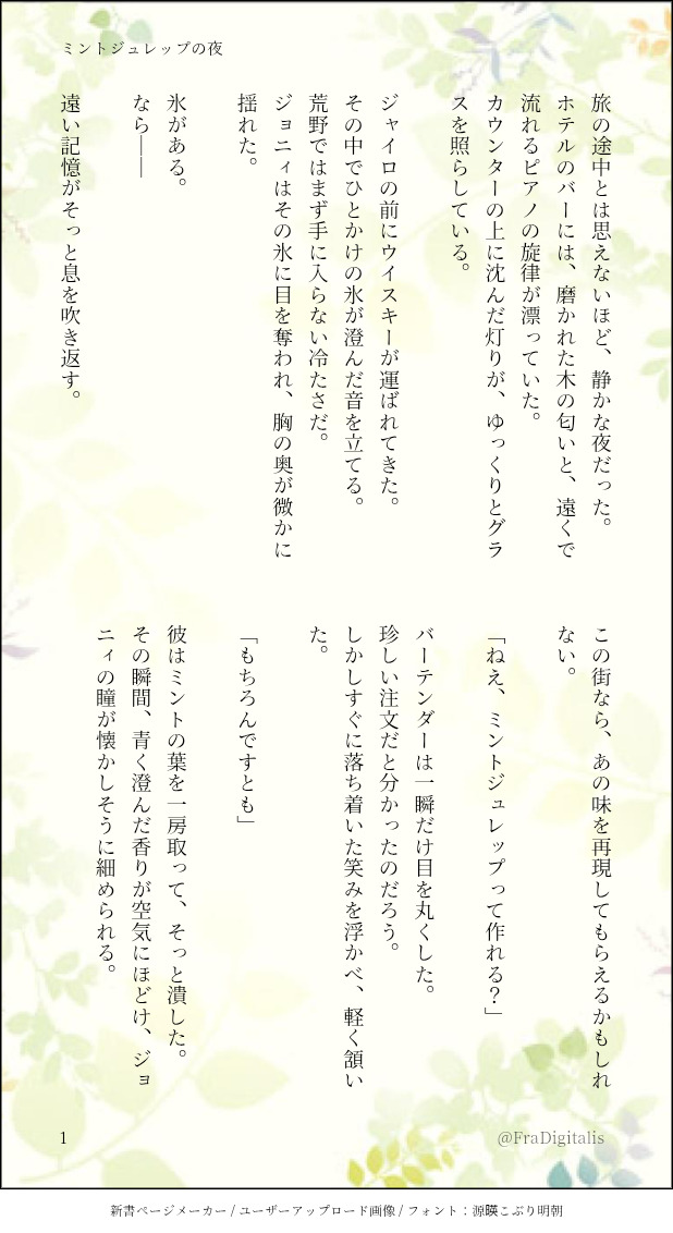 野窓@炭水化物に魂は売った☆quiet followDONE変な時間に目ぇ覚めたときの、最近のお供になりつつある掌編執筆。『ミントジュレップ』はケンタッキーダービー名物のカクテル。 #SBR #ジャイジョニ jaijoni. #JOJO腐 show all(+4 images) Tap to full screen (size:618x1132).Repost is prohibited Let's send reactions! freqpopularsnackothersPayment processing Replies from the creator Follow creator you care about!☆quiet follow 野窓@炭水化物に魂は売ったDONE眠れない夜のお供に、ジャイジョニを書く習慣をつけてる気がしないでもない。 3 野窓@炭水化物に魂は売ったDONE変な時間に目ぇ覚めたときの、最近のお供になりつつある掌編執筆。『ミントジュレップ』はケンタッキーダービー名物のカクテル。 5 野窓@炭水化物に魂は売ったDONE昔の掌編を手直し。こんなことやってるから眠れないんだろうなあ。これも『できた』でも『供養』でもなくリメイクが正しいよね。 5 野窓@炭水化物に魂は売ったDONE変な時間に目ぇ覚めたから、昔の掌編を手直し。……これ、『できた』というより、リメイクとかだよなあ。 5 野窓@炭水化物に魂は売ったDONE変な時間に目が覚めて書きました。誰かホットワインいれてくれ。掌編ジャイジョニ。 3 野窓@炭水化物に魂は売ったDONE枝(@konnnitihaeda)さんの『#DieJoniマンスリー企画』にコッソリ参加した掌編。Xにも投稿したけれど、一応こっちにもあげておく。……これ、ホットチョコレート=ディエゴという暗喩、伝わってんのかなあ…? 7 related works 939DOODLE[R18]threesome warningGyro x Gyro x Johnny 939DONE[R18] Succubus Johnny 2 まー🐸DONE前回掲載した絵を描いてる時に気付いたのです。服を描いてない絵は、いつもより早く描き終わることができる、と😌………当たり前やがね。※女体化でチョメチョメ 939DONE[R18] Succubus Johnny 2 939PAST[R18]ジャイジョニ まー🐸DONE面倒くさがらずに服を描いた自分を褒めてあげたい🙄 2 939PAST[R18]ジャイジョニ 939DOODLE[R18]threesome warningGyro x Gyro x Johnny まー🐸DONE野営中にイチャイチャしとる的な…🙄