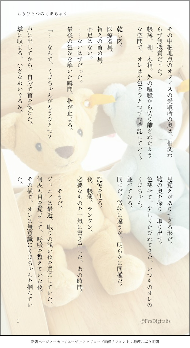 野窓@炭水化物に魂は売った☆quiet followTRAINING今日も今日とて眠れない日のお供。掌編を書く。 #SBR #ジャイジョニ jaijoni. #JOJO腐 show all(+2 images) Tap to full screen (size:618x1132).Repost is prohibited Let's send reactions! freqpopularsnackothersPayment processing Replies from the creator Follow creator you care about!☆quiet follow 野窓@炭水化物に魂は売ったTRAININGもう少し膨らませられれば、(お返しにジョニィがジャイロの髪を切るとかすれば)短編くらいになりそうだけど、それをすると蛇足になると思った。 4 野窓@炭水化物に魂は売ったMOURNINGワンライで書いた、お題『青』を供養。書いてた当時、篠原美也子の『海になれない青』を聴いてたな。 3 野窓@炭水化物に魂は売ったTRAINING新年早々眠れていないのは、昨日ゴロゴロ昼間眠ってたからだよ、たぶん。 3 野窓@炭水化物に魂は売ったTRAINING今日も今日とて眠れない日のお供。掌編を書く。 3 野窓@炭水化物に魂は売ったDONE枝(@konnnitihaeda)さんの#DieJoniマンスリー企画 12月Pixivで連載してたコレ(https://www.pixiv.net/novel/series/14583723)の『クリスマス編』になりますが、単体でも読めるはず……お題 『クリスマス』×『バカ』横書きのほうが読みやすいかもしれない人のためのテスト。 4975 野窓@炭水化物に魂は売ったTRAININGたぶん出会って間もない頃のジャイジョニ。 3 related works nukarumiDONEジョニィちゃんの生首虐待!ビターチョコとイチゴソースです! nukarumiDONEラブレターからのリクエストで「バニーガールの衣装を着る女装ジョニィちゃん」です!リクエストありがとうございましたー!!!♡ nukarumiTRAININGグロの練習…難しいいいいいけど楽しかった 4 てんは天ぷらが好きDOODLEスター・リリー。花言葉は「誇り」そして「純粋」https://twitter.com/ten_dondondon/status/1221431824137641985?s=19 てんは天ぷらが好きDOODLEグラジオラスの花言葉は「勝利」「用心」「密会」。https://twitter.com/ten_dondondon/status/1215285323384537089?s=19 nukarumiDONE⚠gyjoで人外×人間パロ✨挿入はしてないけど絡んでるしjohnnyちゃんが裸なのでポイピクにワンクッションでアップしますね⚠ nukarumiDONE貧乳ジョニィ♀ちゃん乳首丸見えなので一応ワンクッション てんは天ぷらが好きDOODLEhttps://twitter.com/ten_dondondon/status/1211497359349145602?s=19 nukarumiDONE異形化ジョニィちゃん🐙海の悪魔💚 recommended works cercaconunamoogMOURNING #ジャイロ #SBR てんは天ぷらが好きDOODLE林檎の花言葉は「選択」そして「後悔」https://twitter.com/ten_dondondon/status/1234814128830599168?s=19 A·GDOODLE おじじ🦖DOODLE*ジョルDI○*動画に使った絵。 4 ℯ𝓁PAST🍓🍊「イれるのはヤダけど……それくらいなら…」みたいなノリで始めた "エッ〇ごっこ"🍊くんは "ソコ" のキモチ良さに気づいてしまった……???不慣れな2人だからこその可愛さ…💚🧡[12/30/2024] お引越ししました。 3 ℯ𝓁MOURNING🔫🐞🔫:お前から来るとか どういう風の吹き回しだ〜?? (めちゃめちゃ嬉しそう)🐞:………🔫:……あー分かった分かった なんも聞くなってことだな (黙ってナデナデしてあげる)[12/30/2024] お引越ししました。 2 Kurumi_paaaanSPOILERcoc『若鷲の双眸』Day1発言まとめメーカー trpg_yuraINFO⋆⸜ 𝗖𝗼𝗖 ディープブルーにキラめいて ⸝⋆ᴋᴘ やじるしさん ᴘʟ/ᴘᴄ HOアイドル ゆら / 仁芽 よつ葉HOマネージャー 七緒さん / 笹谷 小太郎🪼 END-Blueブルキラ通過したよ〜〜‼️‼️ここが地獄ってワケ〜〜‼️‼️😄🎶本当に楽しかった💃相方さんとKPさんには大感謝しかないです………🥹🫶🏻「世界一かっこいいアイドルになるから」 あか子 :)DONEJO1デビュー5周年おめでとうXに載せたものを加筆修正しました(⋈ ᵕ̤ᴗᵕ̤) ♡♡♡https://x.com/oisiomuraisu/status/1896901060977143942?s=46