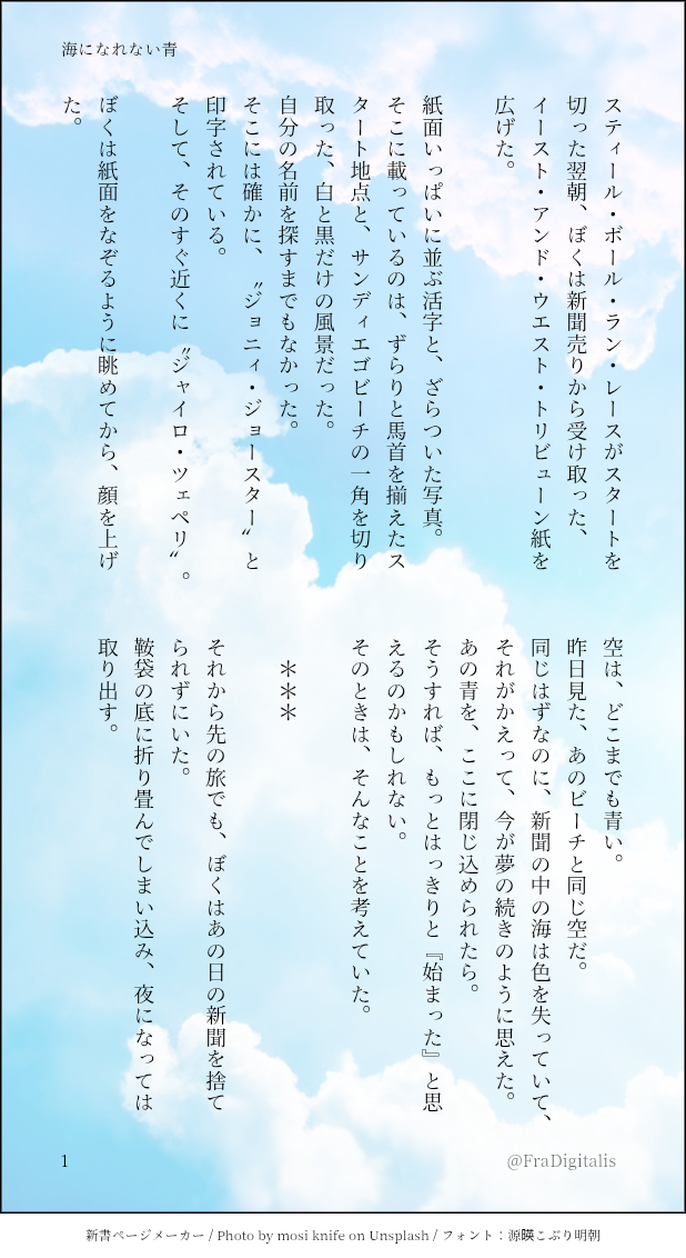 野窓@炭水化物に魂は売った☆quiet followMOURNINGワンライで書いた、お題『青』を供養。書いてた当時、篠原美也子の『海になれない青』を聴いてたな。 #SBR #ジャイジョニ jaijoni. #JOJO腐 show all(+2 images) Tap to full screen (size:618x1132).Repost is prohibited Let's send reactions! freqpopularsnackothersPayment processing Replies from the creator Follow creator you care about!☆quiet follow 野窓@炭水化物に魂は売ったTRAININGもう少し膨らませられれば、(お返しにジョニィがジャイロの髪を切るとかすれば)短編くらいになりそうだけど、それをすると蛇足になると思った。 4 野窓@炭水化物に魂は売ったMOURNINGワンライで書いた、お題『青』を供養。書いてた当時、篠原美也子の『海になれない青』を聴いてたな。 3 野窓@炭水化物に魂は売ったTRAINING新年早々眠れていないのは、昨日ゴロゴロ昼間眠ってたからだよ、たぶん。 3 野窓@炭水化物に魂は売ったTRAINING今日も今日とて眠れない日のお供。掌編を書く。 3 野窓@炭水化物に魂は売ったDONE枝(@konnnitihaeda)さんの#DieJoniマンスリー企画 12月Pixivで連載してたコレ(https://www.pixiv.net/novel/series/14583723)の『クリスマス編』になりますが、単体でも読めるはず……お題 『クリスマス』×『バカ』横書きのほうが読みやすいかもしれない人のためのテスト。 4975 野窓@炭水化物に魂は売ったTRAININGたぶん出会って間もない頃のジャイジョニ。 3 related works おじじ🦖DOODLEジョナディォ 酒癖の悪いディォ② 7 おじじ🦖DOODLE*モブディォ/子ディォ* おじじ🦖DOODLE*ジョナディォ/女体化/にょた百合*えろ絵チャにて、手マソ🫴 おじじ🦖PAST過去絵。服に飽きたD様。 おじじ🦖DOODLE*ジョナディォ/ケモ*ラグビージョナディォとケモジョナディォ、動画に使った絵。 9 おじじ🦖DOODLE*承D*ネロぴゃあ〜さんちのチミD様を描かせていただきました。 おじじ🦖DOODLE*ジョナディォ*動画に使ったやつ。ディォって声だけでジョナだと判別出来てそう。 6 おじじ🦖DOODLEジョナディォ/ミュのネタバレ 動画に使った絵。 6 おじじ🦖DOODLE*ジョナディォ*動画に使った絵。 3 recommended works @nari-----------DONEジョジョの絵を詰めました 6 RuttaPROGRESS息するかのやうにクロスオーバーする奴← おじじ🦖DOODLE*ジョナディォ*動画に使った絵。 3 AizuKaDOODLEHint : yes/no? = AritoyaCAN’T MAKE 2 Kurumi_paaaanSPOILERcoc『若鷲の双眸』Day1発言まとめメーカー ごはんおかわりDOODLE花洋(R18)すけべ絵です2月11日の新刊落としちゃったのでサンプル用に保存してた数枚だけ、記念にこちらに置いときます! 4 TKG_LioNSPOILERCoC 「四季送り」 HO春のプレイリストです。A.さんが作ってくださった素敵なテンプレート借りちゃった🫰2枚目からおもっくそネタバレあるので気をつけてね〜! 3 夜桜きよらDONE愛をこめて花束を💐