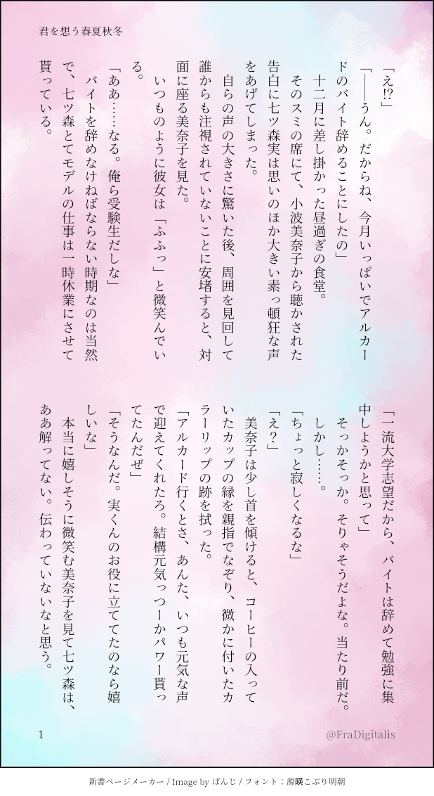 野窓🦊☆quiet followDONE一月にアルカードを辞められ、卒業までデートしなかったせいでアーチから降りてしまった七ツ森くんがモダモダする七マリです。カッコいい七ツ森くんはいません。マリィ=小波美奈子 #ときメモGS4 tokiMemoGs4 #七マリ show all(+28 images) Tap to full screen (size:618x1132).Repost is prohibited Let's send reactions! freqpopularsnackothersPayment processing Replies from the creator Follow creator you care about!☆quiet follow 野窓🦊DONE七マリ学園演劇、文化祭の話。XっていうかTwitterに投稿したやつの削ってないやつ。削ってなかったら、こんなに長くなってたのか。amour inconditionnel=フランス語で『無償の愛』 15 野窓🦊DONEn番煎じの夢精ネタ。マリィの名前は小波美奈子。短いしエ口部分もう少し頑張れ。 5 野窓🦊DONEバレンタインデー七マリ。実際に京都にあるお店をモデルにしていますが、店名など色々と偽造捏造しています。マリィはネームレス。 8 野窓🦊DONE七ツ森実誕生日カウントダウン2023企画に参加させて頂きました。マリィ=小波美奈子七マリ+風本七が少し 12 野窓🦊DONE一月にアルカードを辞められ、卒業までデートしなかったせいでアーチから降りてしまった七ツ森くんがモダモダする七マリです。カッコいい七ツ森くんはいません。マリィ=小波美奈子 29 野窓🦊REHABILI🔞七マリ初夜マリィの名前は小波美奈子です。 14 related works 三葉火壱DONEお誕生日おめでとうしあわせになれ ゆるめの箱DONEお試し投稿。いっくん可愛いね。 nakamu_tokimemoPASTときメモGS4|いのマリとっておきの失敗作 4 こもりDONEラーメン大好きホンダくん リタのらくがき帳DOODLEときメモGS4まとめ1 22 kemii2022DOODLE空也さんのイベントネタバレありマリィと出会ってなかった世界線の空也さん。やべぇ。 こもりDONEだいち〜! こもりDONEOPダーホン! みつまPASTちょっと80年代風にしたかった颯砂くん。 recommended works リタのらくがき帳DOODLEときメモGS4まとめ3 7 h_qhx5TRAINING練習練習。服も身体も描けませぬ😭もっと頑張ろ。絵の感じも定まらない〜これは、妄想同年代御影さんのつもり 鍵子@GS4プレイ中MENU七マリ 美容室に行った帰り、スーパーの駐車場でツイート(垂れ流)した七ツ森くんのお話です。せっかく出来たものは、出来はともかくアップしていく所存。枯れ木も山の賑わい的な❤️ちょっとだけ加筆しました。 1252 隅幸(すみゆき)DOODLEにゃにゃツもr…七ツ森くんお誕生日おめでとう!!!(攻略本に載っていた開始時メッセージの七ツ森くん誕生日ver.の内容からの妄想だけど、実際に聴いたら落ち着いた七ツ森くんだったので、ふざけてしまった事を本当に申し訳なく思っている(震え声)(DLC未購入だから私のデータには猫耳カチューシャは存在しないけれど)(そして実際の開始時メッセージの「おいで」は確実に行ってしまうやつ…!!!) こにゃDOODLEGS4マリィ初描き h_qhx5TRAININGオレンジデイと聞いたので🥺かきました! ______freREHABILIなんか似たシリーズ 3 リピンPAST行くん chikuwacheINFO10/30 GS webオンリー「ようこそはばたき市へ2年生」に参加します。成人向玲マリ漫画「夢みる黒糖」68P 本編59P おまけらくがき2P1200円当日0:00~BOOTHの通販にて頒布予定BOOTHの倉庫から発送されるのでBOOTH倉庫発送の他の同人誌とまとめて購入できます。ほぼえっちしてるだけの本なのでえっちな玲マリが見たい方におすすめです。 13