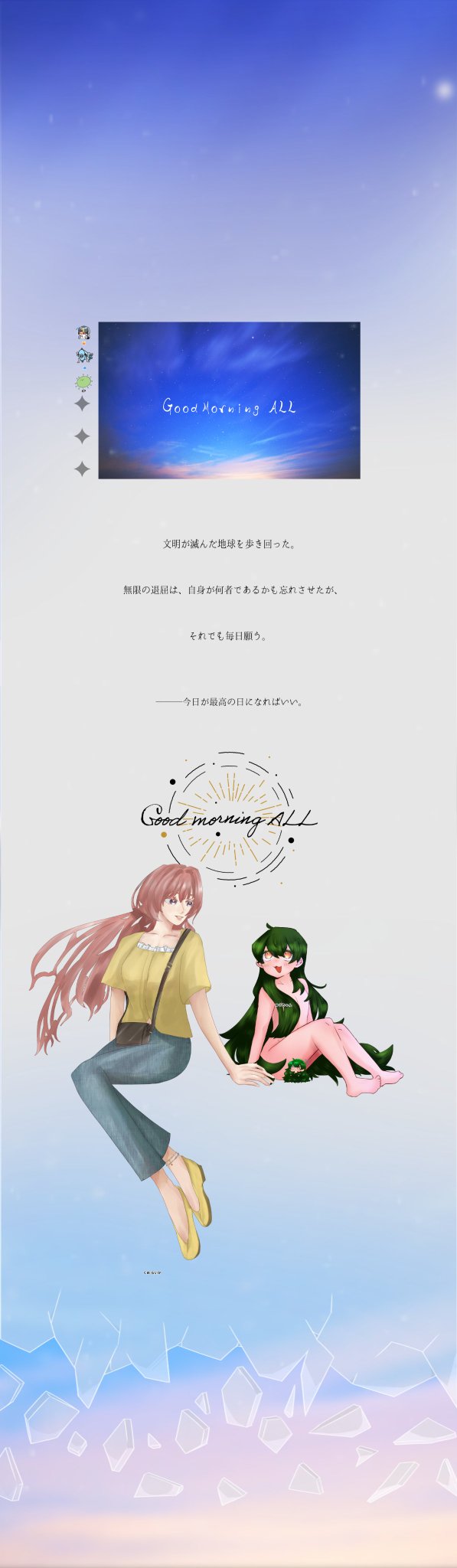 gyokai010101☆quiet followSPOILERCoCTRPG『Goodmorning ALL』KP:🦠PC/PLHO不老不死:ゆうちゃん/🐱HO重病人:九目 来夏/🐟END:A-両生還 #GoodmorningALL show all(+1 images) Tap to full screen (size:597x2048).Repost is prohibited Let's send reactions! freqpopularsnackothersPayment processing Replies from the creator Follow creator you care about!☆quiet follow gyokai010101PROGRESS神と悪魔のおまじない HO🐌🚬立ち絵から練る作戦 2 gyokai010101SPOILER「Princess Hugging Race!!!」KPC/KPليلى نور عبد الرحمن /🐱PC/PL永鳥 遠矢/🐟遊園地で遊んでもろたで✌🏻 gyokai010101SPOILERCoC「かけろ!トルネンブラスベガス」KPC/KP明石 千樂/みかんさんPC/PL佐々木 要/あっぴちゃん四月 小弥太/サビさん伯備 水月/🐟チャリンチャリンチャリン💰 gyokai010101SPOILERホテルアンデルセンへようこそ 現未❌ HO母親秘匿内容ネタバレあり初期案とか、立ち絵差分 とか 5 gyokai010101SPOILERCoCTRPG『静なるテロリスタ』KP:🧶HO童子:愛宕 梨花/🐰HO篤学者:香田 千明/🦠HO美術家:永鳥 遠矢/🐟HO異邦人:ليلى نور عبد الرحمن/🐱3生還1ロストにてEND9C3Fだょ〜ん✌️ gyokai010101SPOILER静なるテロリスタ 現未❌HO美術家のあそこれそれどれ通過済み?yes/no 11 related works risuta_otakuSPOILERCoC 6th「Good morning ALL」で使用した立ち絵 6 setsuDONE2023/9/28~「Good morning ALL」HO不老不死???→タマ-Tama- 柚木@trpgDONEGood morning ALL 不老不死ディスプレイと顔差分 4 あゔぃSPOILER攻略後のシナリオ投稿順が前後してしまいましたがTRPGシナリオ『Good Morning ALL』記念絵(⚠️完全なネタバレを含みます。未通過の方は注意) 2 ocha_hatakeSPOILERGoodmorningALL☔️☀️ 1陣感想現行未通過❌ 1375 ocha_hatakeSPOILERぐどもネタバレ落書き_✍現行未通過閲覧NGお疲れ様でした!さくちゃん、まりんさん本当にありがとうございます(´;ω;`)✨ 5 卓絵のまとめDOODLEグドモENDバレを含みます現行未通過❌ 3 あざらしSPOILERGood morning ALL を重病人PLで努めました。KPの粋な采配で転生エンドを迎えられました。すでに脳が焼かれているので、いろんな語りはふせったーでぎゃいぎゃいしてるんですけど、最高ですね。RP中ガチ泣きしてましたがRPは意地でもやりました。泣かすな。実質ロストなので転生済翠くんの成長した姿を継続で作っていいですか?作るね 2 卓絵のまとめSPOILER🍪🍬☀️Good morning All☀️🍬🍪自陣通過 終盤ネタバレ⭕️※KPによる二次創作、PLの解釈違いだった場合消します。 837
