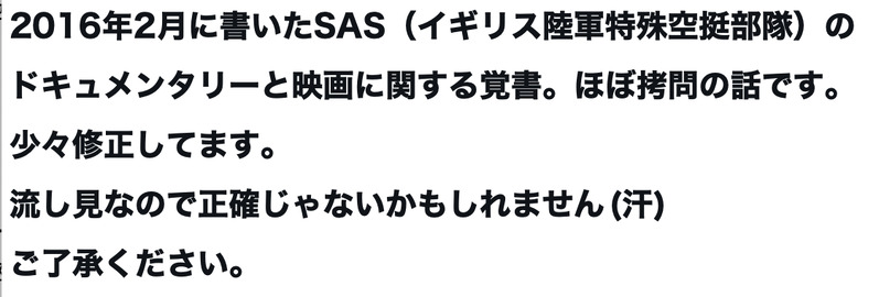 2016年2月に書いたSAS(イギリス陸軍特殊空挺部隊)のドキュメンタリーと映画に関する覚書。