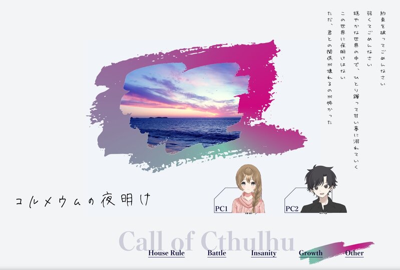 kamishiro setu☆quiet followINFOCoC『コルメウムの夜明け』KPC:佐川 大翔(雪津)PC:天野 美夕(ほしくらげさん)ENDillustration(Free)KPC:みちる様(https://picrew.me/ja/image_maker/1747767)PC:こんぺいとう**様(https://picrew.me/ja/image_maker/318008)days:2023/04/17PTA02 ##KP ##氷海 Tap to full screen (size:1716x1157).Repost is prohibited Let's send reactions! freqpopularsnackothersPayment processing Replies from the creator Follow creator you care about!☆quiet follow kamishiro setuINFOCoC『シキラレ■■』KPレスPC1:赤志 健一(雪津)PC2:紫月(ほしくらげさん)両生還days:2023/04/22片鱗組02 kamishiro setuINFOエモクロア『サヨナラエデン』DL:ゆうきちさんPC:桐谷 俊也(雪津)illustration(Free)PC:北河ゆに様(https://hanitou.booth.pm/items/4675235)生還days:2023/04/21 kamishiro setuINFOCoC『ムユウの水槽』KPC:海星 旭(ほしくらげさん)PC:秋草 千歳(雪津)ENDillustrationKPC:にじせ様PC:アポロ様days:2023/04/21暁14 kamishiro setuINFOCoC『唸れ!暁コメディーショー』KP:のしさんHO1:白樺 青央(かいさん)HO2:黒鉄 紅一(雪津)illustrationHO1&HO2:のしさんエンドA 両生還days:2023/04/15-20 kamishiro setuINFOCoC『コルメウムの夜明け』KPC:佐川 大翔(雪津)PC:天野 美夕(ほしくらげさん)ENDillustration(Free)KPC:みちる様(https://picrew.me/ja/image_maker/1747767)PC:こんぺいとう**様(https://picrew.me/ja/image_maker/318008)days:2023/04/17PTA02 kamishiro setuINFOCoC『クラゲが浮かぶ海は空色』KP:紫露草さんPC1:黒木 りと(ほしくらげさん)PC2:近衛 美鈴(雪津)ENDillustration(Free)PC2:hajime様(https://usagi73.booth.pm/items/4292473)days:2023/04/14くらげ組02 recommended works NewRomanticismDONE 紗緒太_2525MOURNINGヨシ👉 Cakypa_404_1228DONE『暖かい人達』*⑳⑲の今日*qちゃんの話qちゃんHBD! 3 inukai_muneoPAST一次創作【WILD RED】の設定です(前に上げた絵反応くださった方有難うございます!ちょっと手直ししたい所ありすぎてまた最初から上げ直すことになりました(汗)) 18 ラテ茶TRAINING🎀🦇✖️♦️ なおすけDOODLEマタタビに敗北する猫三木⚠️ケモ耳、目がハート、大した事ないけど背後注意かも 碧(ao)DONE脱DTシュくんに毎晩求められるアグネスちゃん。攻めをがんばるシュ。オチなし。 kurokimi23DOODLE稽學童の姿 ワビサビDOODLE # 自OCグッドデザイン賞ふざけました() 4