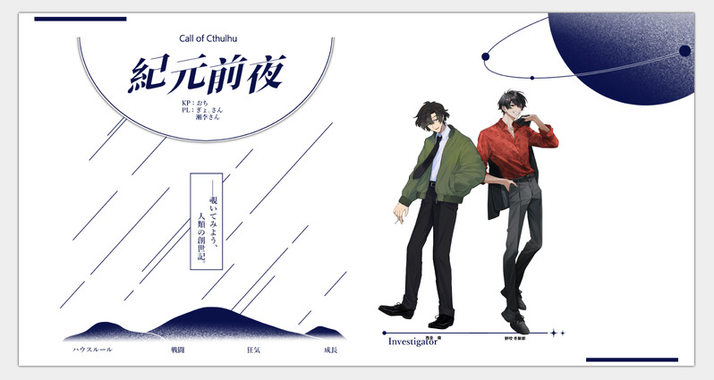 ochiiii_game☆こそフォロお知らせCoC6thシナリオ「紀元前夜」作:角刈りジョニー様KP:おちPL/PC:ぎょ。さん/野咬 C6thシナリオ「紀元前夜」作:角刈りジョニー様KP:おちPL/PC:ぎょ。さん/野咬 冬獅郎 瀬李さん/西金 南第一話…END1両生還第二話…END2両生還第三話…END「歴史の観測者」 タップで全画面(原寸:4920x2619)無断転載禁止 リアクションをたくさん送って応援しよう! よく使う人気おやつその他支払処理中 作者からのリプライ 気になる人をどんどんフォローしよう!☆こそフォロ ochiiii_gameお知らせCoC6thシナリオ「紀元前夜」作:角刈りジョニー様KP:おちPL/PC:ぎょ。さん/野咬 C6thシナリオ「紀元前夜」作:角刈りジョニー様KP:おちPL/PC:ぎょ。さん/野咬 冬獅郎 瀬李さん/西金 南第一話…END1両生還第二話…END2両生還第三話…END「歴史の観測者」 ochiiii_gameお知らせCoC6thシナリオ「東京ゴーストマティカ」作:ビリ庫様KP:あるすんさんPL/PC(HO順):アキラさん/阿羅々鬼 明日果 しのはらさん/コタロー おち/いぶき ピヨさん/青白橡 日影END-1 全生還 ochiiii_gameお知らせCoC6thシナリオ「救世主」作:超高音様KP:クルマさんPL/PC(HO順):きゅーすさん/古幡 烈 ぱんさん/安楽城 憩 おち/金剛 遼END-全ロスト ochiiii_gameお知らせCoC6thシナリオ「海原に嫁す」作:櫻庭様KP/KPC:アキラさん/楽々浦 海吏PL/PC:おち/青原 海END-A 両生還 2 ochiiii_gameお知らせCoC6thシナリオ「MY LITTLE SANCTUARY」作:白鯨書房様KP/KPC:おち/天満 直PL/PC:もすさん/麓原 征成END-A 両生還 ochiiii_gameらくがきCoC6thシナリオ「同窓会」作:桜庭様KP/KPC:もすさん/麓原 往成PL/PC:おち/天満 直END-2 両生還 おすすめ作品 ファイできた初恋拗らせた🐙に処女奪われる話 2 ひじぎん工房らくがきモフフサスケッチ nomstroberyらくがきWhat is his nationality?His name is Kwon Haesanตัวเล็กหมดทุกตัวคับ harbor_town8901らくがき逆バニー着せました女体化です MoonJangjangできたY/N mitukan_ilできた雄堕ち先生 manboina17trpgできたCoC「青い血液でミティ・セラオは満たされるのか」作:クスノキ様KP:睡眠先生HO人殺し:まんぼい/鈴附 舍利(りつき やと)HO鬱病患者:天/白馬 雲(あおうま うん)ENDA-1!!両生還!!!!!!白馬ちゃんに惚れました。 6hachiji5ネタバレ #サイキアクト3ホワイトデーボイスめっちゃ良かった〜〜〜!セリフネタバレなし こんな顔して言ってくれてたのかな〜〜の絵 そうひらくがきアミュレットスペード🐭