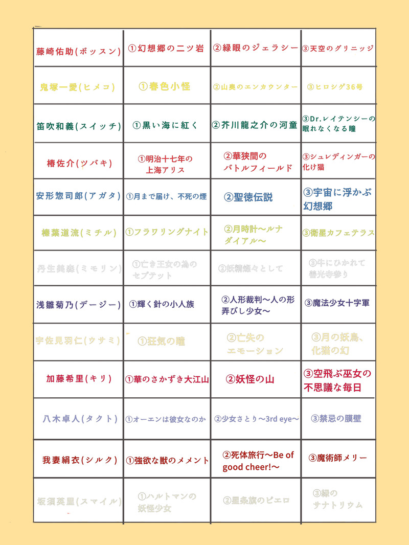 kutouru8090☆quiet followDONE前、ふせったーとかでメモ書き投稿した一部スケダンキャラの東方原曲イメージソング集。を、せっかくだから表にしてみた。わかりやすく、色分けしてみました。 #SKETDANCE Tap to full screen (size:1536x2048).Repost is prohibited Let's send reactions! freqpopularsnackothersPayment processing Replies from the creator Follow creator you care about!☆quiet follow kutouru8090DONE久しぶりに、助のキャラで東方原曲のイメソンを考えて表にしてみました。 kutouru8090DONEスケットダンスキャラでセフィロトの樹の配置を当てはめた感じのメモ。+、タクトとイチジクのやつ。絵はないです。 2 kutouru8090DOODLE続きとか特に考えてない、人外(に片足突っ込んでる)パロのタッくん。ただの雰囲気漫画です。 kutouru8090DONE昨日ぐらいに出したやつの色塗り。(一枚) kutouru8090PAST助の過去落書きまとめ。ほぼタクボスネタ。(ネコツバキいる。) 10 kutouru8090DONEスケダンで、女体幼児化タクト。前にだした落書きのペン入れです。 related works めるPASTスケダン 藤椿、ギリボスあり 女体化あり 15 𝟠𝟚𝟙PASTTwitterのリプ来たキャラの絵を描くみたいなタグの浪漫 めるDONE双子誕生日おめでとう🎊㊗️🎂🎉 ⚫楓井⚫PAST #SKETDANCE 3 kutouru8090DONEいつものイメソンネタです。 ⚫楓井⚫PAST11月11日 2 kutouru8090DONEスケダン世界の簡易版人類悪な八木卓人の、妄想ネタイラスト。 2 kutouru8090DOODLE八木ちゃんの前では、めんどくさい女装だってそつなくこなすタッくん。 らんでぃDONEスケットダンスのヒメコちゃん。 4 recommended works ぬん◎DOODLE霊衣💢💢💢グランパ………… 雨音 鈴DONEアンデルセン先生!お誕生日おめでとう⸜(* ॑ ॑* )⸝ ナルゲさんDOODLE徳川廻天迷宮ネタ。絵本を読んでもらう、ちみっこマシュさんとメジェドさまです。 mare_tkPROGRESSFGOのキャプテン 36konohaTRAININGリリィちゃん oyunoumiDOODLE朕にもそのぶっとい注射刺すつもりか?勘弁してくれんかのうもう少し待ってみるのはどうかのう〜 サラ+@ゲーム好きINFO夏コミでこういうの作る予定です。金曜日 西地区“へ”ブロック-03b よろしくお願いします。 絵がうまくなりたい みゆきDONEアナログと初めて和解できました公式絵を参考に描いています!!!えっっっっっこれはどっからどう見てもオジマンディアス様にみえるはい私ってば天才〜!!!!めっちゃ成長を感じる〜!!!!!!すごいぞ私!判別が出来る絵がかけた!偉い!!寝ろ!おやすみ!!! ak_otherDONEお絵描きリハビリがてらマーリン