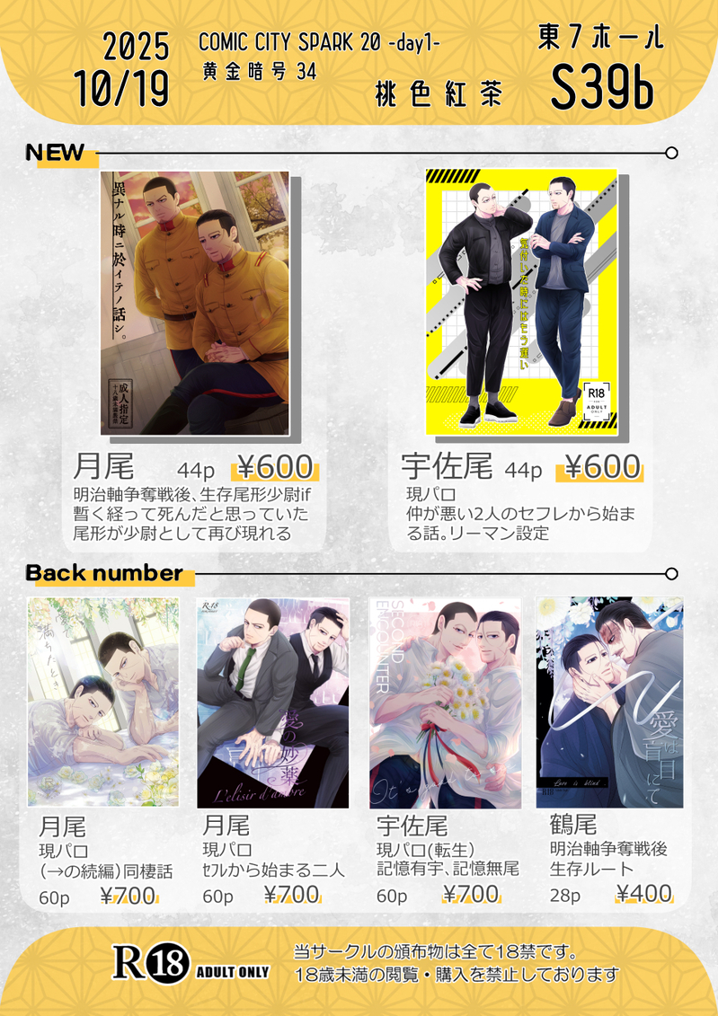 桃子🍑☆quiet followDOODLE2025年10月19日 黄金暗号34(COMIC CITY SPARK20 -day1-)東7ホール S39b 桃色紅茶新刊 月尾、宇佐尾既刊 月尾、宇佐尾、鶴尾頒布物すべて🔞です。年齢確認にご協力をお願いしたします。当日は14時半頃撤収予定です。 #黄金暗号 goldenCode show all(+1 images) Tap to full screen (size:955x1351).Repost is prohibited Let's send reactions! freqpopularsnackothersPayment processing Replies from the creator Follow creator you care about!☆quiet follow 桃子🍑DOODLE2025年10月19日 黄金暗号34(COMIC CITY SPARK20 -day1-)東7ホール S39b 桃色紅茶新刊 月尾、宇佐尾既刊 月尾、宇佐尾、鶴尾頒布物すべて🔞です。年齢確認にご協力をお願いしたします。当日は14時半頃撤収予定です。 2 桃子🍑MENU2025年10月19日 黄金暗号34(COMIC CITY SPARK20-day1-)東7ホール S39b 桃色紅茶「気付いた時にはもう遅い」 A5/44P/R18現パロ宇佐尾。仲が悪い2人のセフレから始まる話。リーマン設定🐯https://ec.toranoana.jp/joshi_r/ec/item/040031274440パス 18↑?( y / n ) 11 桃子🍑MENU2025年10月19日 黄金暗号34 COMIC CITY SPARK20-day1-東7ホール S39b 桃色紅茶「異ナル時ニ於イテノ話シ。」 A5/44P/R18争奪戦後、尾生存の少尉if月尾。死んだと思っていた尾が少尉として目の前に再び現れる。原作ネタバレ含🐯https://ec.toranoana.jp/joshi_r/ec/item/04003127444218↑?(y/n 11 桃子🍑DOODLE3D素材をくっつけて合同官舎を作る 桃子🍑PROGRESS色のセンスがなさすぎる 2509↑10月新刊1冊目表紙ラフ。うーん… 2 桃子🍑PROGRESSUさくさん描くのたのしい(似てない兄弟) related works chokoo_0408MOURNING黄金暗号なの?金神なの?黄金神威なの?金神威なの??伏せ字は何が正しいの??真実はコンフィデンスマンのみぞ知るの???キラウシが可愛すぎるのにグッズがないのは何なの???出せよ!!!!!ください!!!!尾や杉や菊や門が鬼かっこよきなのに私の絵柄に合わなすぎて泣く描けない描きたい大泣 9 桃子🍑DOODLE2025年10月19日 黄金暗号34(COMIC CITY SPARK20 -day1-)東7ホール S39b 桃色紅茶新刊 月尾、宇佐尾既刊 月尾、宇佐尾、鶴尾頒布物すべて🔞です。年齢確認にご協力をお願いしたします。当日は14時半頃撤収予定です。 2 桃子🍑MENU2025年10月19日 黄金暗号34(COMIC CITY SPARK20-day1-)東7ホール S39b 桃色紅茶「気付いた時にはもう遅い」 A5/44P/R18現パロ宇佐尾。仲が悪い2人のセフレから始まる話。リーマン設定🐯https://ec.toranoana.jp/joshi_r/ec/item/040031274440パス 18↑?( y / n ) 11 桃子🍑MENU2025年10月19日 黄金暗号34 COMIC CITY SPARK20-day1-東7ホール S39b 桃色紅茶「異ナル時ニ於イテノ話シ。」 A5/44P/R18争奪戦後、尾生存の少尉if月尾。死んだと思っていた尾が少尉として目の前に再び現れる。原作ネタバレ含🐯https://ec.toranoana.jp/joshi_r/ec/item/04003127444218↑?(y/n 11 setoknkm_11INFO【サンプル】『恋一歩先の愛と』杉ㇼパ R18(18歳未満閲覧/購入禁止)(表紙込み)P38/700円SUPER COMIC CITY 30 -day2-黄金暗号2023東3 フ 43a たぬき屋にて配布予定 10