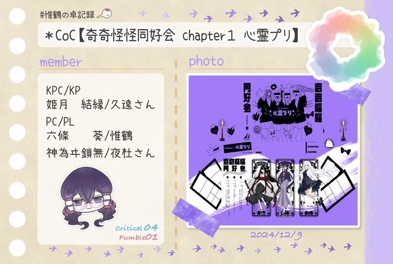 惟鶴(いづる)☆quiet followDONE*CoC【奇奇怪怪同好会 chapter1心霊プリ】KPC/KP姫月 結縁/久遠さんPC/PL六條 葵/惟鶴神為ヰ鎖無/夜杜さん #惟鶴の卓記録 show all(+1 images) Tap to full screen (size:1764x1185).Repost is prohibited Let's send reactions! freqpopularsnackothersPayment processing Replies from the creator Follow creator you care about!☆quiet follow 惟鶴(いづる)SPOILER*CoC【膿み堕とし】卓らくがき⚠️⚠️⚠️ネタバレ注意⚠️⚠️⚠️PASS=y 4 惟鶴(いづる)DONE*CoC【膿み堕とし】KP:矢野さんHO壱 被害者:壱岐 千景/しずくさんHO弐 加害者:氷見 灯花/サニーさんHO参 傍観者:木津月 綾人/くるみさんHO伍 邪魔者:五戸瀬 御幸/惟鶴 4 惟鶴(いづる)DONE🎃Happy Halloween!🎃character: Luce・Colore 惟鶴(いづる)DONE*CoC【奇奇怪怪同好会 chapter3 幽園地】KPC/KP姫月 結縁/久遠さんPC/PL六條 葵/惟鶴神為ヰ鎖無/夜杜さん 2 惟鶴(いづる)DONE*CoC【Cooperated Operation】KP:カシスナッツさんPC/PL北条千草/惟鶴煋南/shuuuさん細雪リツカ/kanataさんカザハナ/昇天さん 3 惟鶴(いづる)DONE*CoC【奇奇怪怪同好会 chapter2 幽霊映画館】KPC/KP姫月 結縁/久遠さんPC/PL六條 葵/惟鶴神為ヰ鎖無/夜杜さん 2 related works 惟鶴(いづる)DONECoC【大正グロテスキズム】KP:惟鶴PC1精神科医:芥子奈 右近/asatoさんPC2小説家:東雲 吟/彼方怜異さん 2 惟鶴(いづる)DONE*CoC【グランドグラビティ】KP:久遠さんPC/PL歌騙己己尽/夜杜さん棗 由良/ひすいさん十司 真木/惟鶴 2 惟鶴(いづる)DONE*CoC【奇奇怪怪同好会 chapter1心霊プリ】KPC/KP姫月 結縁/久遠さんPC/PL六條 葵/惟鶴神為ヰ鎖無/夜杜さん 2 惟鶴(いづる)DONE*CoC【Joker≒Joker】KP:シーナさんHO♤:ブルーバード/ジョリさんHO♡:ハーネット/ひなたさんHO♢:リラ/惟鶴HO♧:レングマン/鹿猫さん 3 惟鶴(いづる)DONE* CoC【間も無く、最終電車が参ります。】KP:惟鶴PC/PL:寒鳥 皇/カシスナッツさん矢野川憶李/昇天さん宇治 京梧/shuuuさん 2 惟鶴(いづる)DONE*CoC【Good night,Judas.】KP:ららうさぎさんHO1:掛井紳司/ぽるかさんHO2:戌亥文聡/彼方怜異さんHO3:須賀烈斗/asatoさんHO4:雨倉燕時/惟鶴 3 惟鶴(いづる)DONE*CoC【犬猫戦争は、終わらせない。】KP:惟鶴HO1犬:狛犬 一之助/水煙さんHO2猫:南古屋 猫央/ひなたさん 2 惟鶴(いづる)DONE*CoC【理不尽sermarie】KPC/KP白椿翠鳥/久遠さんPC/PL真鴨祥午/惟鶴 2 惟鶴(いづる)DONE*CoC【奇奇怪怪同好会 chapter2 幽霊映画館】KPC/KP姫月 結縁/久遠さんPC/PL六條 葵/惟鶴神為ヰ鎖無/夜杜さん 2 recommended works peachnpuccaREHABILI铁瘫 惯用伎俩 Hello WorldPAST原 3 hkkmrbsTRAINING美しい石像を見ると、ついかみゅで描きたくなってしまう…芸術や宗教にも適合するかみゅのポテンシャルやばいよぉ natfanDONE 3 natfanDONE 2 natfanDONE 3 TrueViADOODLE~ TFA OC ~Aventurine Prime Mr.TDONE飛鳥 M_equeDONE体格とインナー、着衣の差分と、筋肉量の比較 6