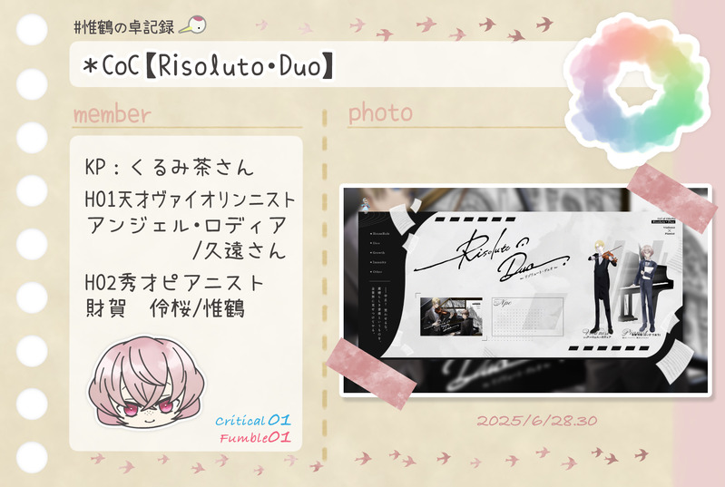 惟鶴(いづる)☆quiet followDONE*CoC【Risoluto・Duo】KP:くるみ茶さんHO1天才ヴァイオリンニスト:アンジェル・ロディア/久遠さんHO2秀才ピアニスト:財賀 伶桜/惟鶴 #惟鶴の卓記録 show all(+2 images) Tap to full screen (size:1764x1185).Repost is prohibited Let's send reactions! freqpopularsnackothersPayment processing Replies from the creator Follow creator you care about!☆quiet follow 惟鶴(いづる)DONE*CoC【タコキャンディー】KPレス白金 大我/惟鶴 2 惟鶴(いづる)DONE*CoC【ヨモツマイリ】KP:惟鶴PC/PL:時雨 姫桐/モチさん 2 惟鶴(いづる)DONE*CoC【シルバーバレットは不死の夢を見るか?】KP:惟鶴PC1狩人:シャルト/YさんPC2銀の弾丸:キャロット/asatoさん 2 惟鶴(いづる)DONE*CoC【悪辣】KP:みつをさんHO1詐欺師:犬童 怜音/ひなたさんHO2薬物売人:苦楽園 楔/水煙さんHO3売春人:淀 舞冬/鹿猫さんHO4宗教家:時羽 啓/惟鶴 3 惟鶴(いづる)DONE*クリティカル&ファンブル スタンプカード2025 6 惟鶴(いづる)DONE*---*---*---*---*---*---*---*---*---* Happy Birthday 10月生まれの子たち*---*---*---*---*---*---*---*---*---* related works 惟鶴(いづる)DONE* CoC【間も無く、最終電車が参ります。】KP:惟鶴PC/PL:寒鳥 皇/カシスナッツさん矢野川憶李/昇天さん宇治 京梧/shuuuさん 2 惟鶴(いづる)DONE*CoC【Joker≒Joker】KP:シーナさんHO♤:ブルーバード/ジョリさんHO♡:ハーネット/ひなたさんHO♢:リラ/惟鶴HO♧:レングマン/鹿猫さん 3 惟鶴(いづる)DONE*CoC【奇奇怪怪同好会 chapter1心霊プリ】KPC/KP姫月 結縁/久遠さんPC/PL六條 葵/惟鶴神為ヰ鎖無/夜杜さん 2 惟鶴(いづる)DONE*CoC【奇奇怪怪同好会 chapter2 幽霊映画館】KPC/KP姫月 結縁/久遠さんPC/PL六條 葵/惟鶴神為ヰ鎖無/夜杜さん 2 惟鶴(いづる)DONECoC【大正グロテスキズム】KP:惟鶴PC1精神科医:芥子奈 右近/asatoさんPC2小説家:東雲 吟/彼方怜異さん 2 惟鶴(いづる)DONE*CoC【グランドグラビティ】KP:久遠さんPC/PL歌騙己己尽/夜杜さん棗 由良/ひすいさん十司 真木/惟鶴 2 惟鶴(いづる)DONE*CoC【Good night,Judas.】KP:ららうさぎさんHO1:掛井紳司/ぽるかさんHO2:戌亥文聡/彼方怜異さんHO3:須賀烈斗/asatoさんHO4:雨倉燕時/惟鶴 3 惟鶴(いづる)DONE*CoC【犬猫戦争は、終わらせない。】KP:惟鶴HO1犬:狛犬 一之助/水煙さんHO2猫:南古屋 猫央/ひなたさん 2 惟鶴(いづる)DONE*CoC【理不尽sermarie】KPC/KP白椿翠鳥/久遠さんPC/PL真鴨祥午/惟鶴 2 recommended works yuito_dream27DONE #夜の819プラス #夜のHQプラス スナ🌸【恋愛初心者な年下彼女とはじめての。】※♡喘ぎ、濁点表現あり未成年閲覧NG🙅♀成人済みですか?▶( yes / no ) 11 0501luge_BBPROGRESSひゅるりらぱっぱのよしかげさんが描きたかった 2 a_tian___MAIKINGrsyt的なアレ enaena_lilyPAST寒い日のタテガミ🦁×幼馴染の婚約者 ゲドえもんTRAINING kara4KIMi3DOODLE庭師 プル夜現行未通過❌ 柚木@trpgINFOCoC『covenant』 KPきらさん PL/PC 柚木/宇佐美 日和 ED『最愛の人』全生還にてシナリオ終了きらさんがオリジナルシナリオを回してくださいました…!!ソプスクHO3で通過いたしました!楽しいセッションありがとうございました! ごしきDONE当時のコスチュームを会場で見ることができて嬉しかったです……! 2 巡04DOODLEラキドlog③ 22
