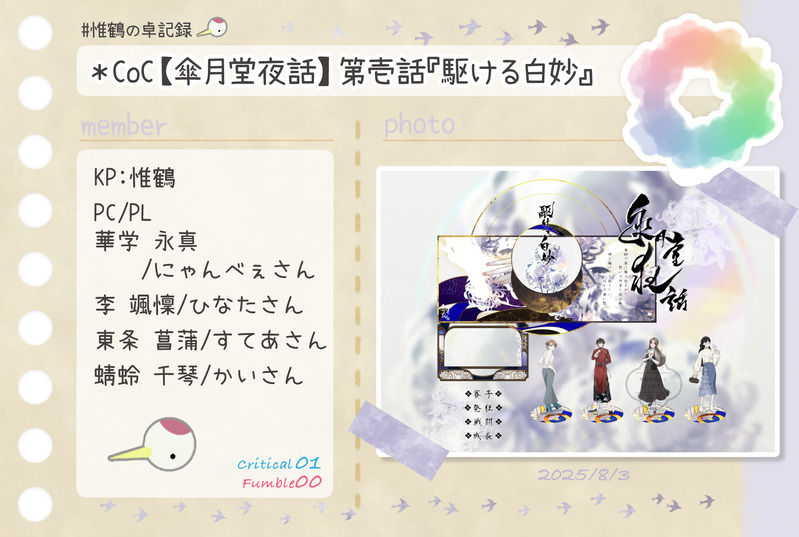 惟鶴(いづる)☆quiet followDONE*CoC【傘月堂夜話】 第壱話『駆ける白妙』KP:惟鶴PC/PL華学 永真/にゃんべぇさん李 颯懍/ひなたさん東条 菖蒲/すてあさん蜻蛉 千琴/かいさん #惟鶴の卓記録 show all(+1 images) Tap to full screen (size:1764x1185).Repost is prohibited Let's send reactions! freqpopularsnackothersPayment processing Replies from the creator Follow creator you care about!☆quiet follow 惟鶴(いづる)DONE*CoC【奇奇怪怪同好会 chapter2 幽霊映画館】KPC/KP姫月 結縁/久遠さんPC/PL六條 葵/惟鶴神為ヰ鎖無/夜杜さん 2 惟鶴(いづる)DONE*CoC【傘月堂夜話】第参話『玄い眸』KP:惟鶴PC/PL駒鳥 朱/さくさん白金 大我/惟鶴北武 六花/Mayuさん青島 竜樹/めいそうさん 2 惟鶴(いづる)DONE*---*---*---*---*---*---*---*---*---* Happy Birthday 9月生まれの子たち*---*---*---*---*---*---*---*---*---* 惟鶴(いづる)DONE*CoC【灰と甘露】KP:ななさんHO1×稲荷空狐:瀬田 彩華/雪鶴花さんHO2×七歩蛇:八雲 澪/惟鶴HO3×獏:柳 容二/手袋さんHO4×橋姫:一条 桃椛/MayuさんHO5×絡新婦:細蟹 契/めいそうさんHO6×蝶化身:麓山 珠莉/ももさん 5 惟鶴(いづる)DONE*CoC【ドロップアウトヴァンパイア】HO1届人/KP:二階堂 賢梨/惟鶴HO2殺人:シュン/ヒノリさん 3 惟鶴(いづる)DONE*CoC【傘月堂夜話】 2025.9.22-23第伍話『桜隠し』エピローグ『桜の下の満開の宴』KP:惟鶴PC/PL華学 永真/にゃんべぇさん李 颯懍/ひなたさん東条 菖蒲/すてあさん蜻蛉 千琴/かいさん 4 related works 惟鶴(いづる)DONE*CoC【Good night,Judas.】KP:ららうさぎさんHO1:掛井紳司/ぽるかさんHO2:戌亥文聡/彼方怜異さんHO3:須賀烈斗/asatoさんHO4:雨倉燕時/惟鶴 3 惟鶴(いづる)DONE*CoC【犬猫戦争は、終わらせない。】KP:惟鶴HO1犬:狛犬 一之助/水煙さんHO2猫:南古屋 猫央/ひなたさん 2 惟鶴(いづる)DONECoC【大正グロテスキズム】KP:惟鶴PC1精神科医:芥子奈 右近/asatoさんPC2小説家:東雲 吟/彼方怜異さん 2 惟鶴(いづる)DONE*CoC【奇奇怪怪同好会 chapter1心霊プリ】KPC/KP姫月 結縁/久遠さんPC/PL六條 葵/惟鶴神為ヰ鎖無/夜杜さん 2 惟鶴(いづる)DONE*CoC【奇奇怪怪同好会 chapter2 幽霊映画館】KPC/KP姫月 結縁/久遠さんPC/PL六條 葵/惟鶴神為ヰ鎖無/夜杜さん 2 惟鶴(いづる)DONE*CoC【グランドグラビティ】KP:久遠さんPC/PL歌騙己己尽/夜杜さん棗 由良/ひすいさん十司 真木/惟鶴 2 惟鶴(いづる)DONE*CoC【Joker≒Joker】KP:シーナさんHO♤:ブルーバード/ジョリさんHO♡:ハーネット/ひなたさんHO♢:リラ/惟鶴HO♧:レングマン/鹿猫さん 3 惟鶴(いづる)DONE* CoC【間も無く、最終電車が参ります。】KP:惟鶴PC/PL:寒鳥 皇/カシスナッツさん矢野川憶李/昇天さん宇治 京梧/shuuuさん 2 惟鶴(いづる)DONE*CoC【理不尽sermarie】KPC/KP白椿翠鳥/久遠さんPC/PL真鴨祥午/惟鶴 2 recommended works elle_niyaMAIKING壬猫。推しカプは一緒に寄り添って寝ててほしい。 nd(野田)SPUR ME表紙予定だ!ずっとこんな表紙描きたかったから嬉しい 大遅刻DOODLE※痛そうな沢がいますやりたかったものやっと描けました🐤 2 KhotKhun_KhotTheDOODLE #Tsuzumamo(ชื่อแมว?) 2 _user_nullDOODLEもう一つのtumblrリクエスト〜 これを描くのは楽しかったanother tumblr request~ I had fun drawing this 2 jmilytm95DOODLE治侑 2 place_rimDONE午前6時のブルーアワー煉炭「酔いどれ煉獄さんと」8ページ漫画。中味ない、やまなしおちなし、フワッと読んでいただけたら!パスワードは、CPの英文字四文字です!(イベント時から変更) 8 tumetumep_manDONEknbn以前載せたやつ(パスはデビュー日) ari🐜DOODLEめぐゆじ🐺🐯 2