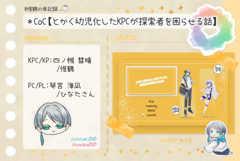 惟鶴(いづる)☆quiet followDONE*CoC【とかく幼児化したKPCが探索者を困らせる話】KPC/KP:四ノ槻 彗晴/惟鶴PC/PL:琴宮 海凪/ひなたさん #惟鶴の卓記録 show all(+2 images) Tap to full screen (size:1764x1185).Repost is prohibited Let's send reactions! freqpopularsnackothersPayment processing Replies from the creator Follow creator you care about!☆quiet follow 惟鶴(いづる)DONE*---*---*---*---*---*---*---*---*---* Happy Birthday 9月生まれの子たち*---*---*---*---*---*---*---*---*---* 惟鶴(いづる)DONE*CoC【灰と甘露】KP:ななさんHO1×稲荷空狐:瀬田 彩華/雪鶴花さんHO2×七歩蛇:八雲 澪/惟鶴HO3×獏:柳 容二/手袋さんHO4×橋姫:一条 桃椛/MayuさんHO5×絡新婦:細蟹 契/めいそうさんHO6×蝶化身:麓山 珠莉/ももさん 5 惟鶴(いづる)DONE*CoC【ドロップアウトヴァンパイア】HO1届人/KP:二階堂 賢梨/惟鶴HO2殺人:シュン/ヒノリさん 3 惟鶴(いづる)DONE*CoC【傘月堂夜話】 2025.9.22-23第伍話『桜隠し』エピローグ『桜の下の満開の宴』KP:惟鶴PC/PL華学 永真/にゃんべぇさん李 颯懍/ひなたさん東条 菖蒲/すてあさん蜻蛉 千琴/かいさん 4 惟鶴(いづる)DONE*CoC【Karmφ -カルマ-】KP:矢野さんPC/PL茜谷 燐火/彼方 怜異さん志摩 香蓮/peace_faceさん須夜崎 泉成/惟鶴南野 風歌/しずくさん 2 惟鶴(いづる)DONE*CoC【とかく幼児化したKPCが探索者を困らせる話】KPC/KP:四ノ槻 彗晴/惟鶴PC/PL:琴宮 海凪/ひなたさん 3 related works 惟鶴(いづる)DONE*CoC【理不尽sermarie】KPC/KP白椿翠鳥/久遠さんPC/PL真鴨祥午/惟鶴 2 惟鶴(いづる)DONE*CoC【犬猫戦争は、終わらせない。】KP:惟鶴HO1犬:狛犬 一之助/水煙さんHO2猫:南古屋 猫央/ひなたさん 2 惟鶴(いづる)DONE*CoC【Good night,Judas.】KP:ららうさぎさんHO1:掛井紳司/ぽるかさんHO2:戌亥文聡/彼方怜異さんHO3:須賀烈斗/asatoさんHO4:雨倉燕時/惟鶴 3 惟鶴(いづる)DONE*CoC【ARCANA】KP:昇天さん SKP:shuuuさん HO1:グリム/カナタさん HO2:コランダム/うみ牛。さん HO3:ギル /memoさん HO4:ラズ/惟鶴 4 惟鶴(いづる)DONE*CoC【Joker≒Joker】KP:シーナさんHO♤:ブルーバード/ジョリさんHO♡:ハーネット/ひなたさんHO♢:リラ/惟鶴HO♧:レングマン/鹿猫さん 3 惟鶴(いづる)DONE* CoC【間も無く、最終電車が参ります。】KP:惟鶴PC/PL:寒鳥 皇/カシスナッツさん矢野川憶李/昇天さん宇治 京梧/shuuuさん 2 惟鶴(いづる)DONE*CoC【奇奇怪怪同好会 chapter1心霊プリ】KPC/KP姫月 結縁/久遠さんPC/PL六條 葵/惟鶴神為ヰ鎖無/夜杜さん 2 惟鶴(いづる)DONE*CoC【グランドグラビティ】KP:久遠さんPC/PL歌騙己己尽/夜杜さん棗 由良/ひすいさん十司 真木/惟鶴 2 惟鶴(いづる)DONECoC【大正グロテスキズム】KP:惟鶴PC1精神科医:芥子奈 右近/asatoさんPC2小説家:東雲 吟/彼方怜異さん 2 recommended works d_n_koroPROGRESS27ページ目 kaina_picturePROGRESSイラスト93途中ここまで描いたけど微妙かもしれない#イラスト初心者 回坑的某人DOODLE虎に甘噛み 第一話上 16 analog_luvDOODLEトランスフォーマー:サイバーバースよりパーセプターとデッドエンド。徹夜明けでデッドエンドの手に癒しを求めるパーセプター。パーセプターの左肩には消えて頂いた。 apiscircensisDOODLE 4azamiPASTタルタまとめ Arts of Tarter 14 ICHIEN_2024DOODLEpassword:deavy ta_fuwafuwaDONE好きラジオ…… KoKokokofuDONE「お守り」ワンドロ 12/7『手編み』 分三井に何かプレゼントしたい洋平の話手編みの要素が申し訳程度です…… 4