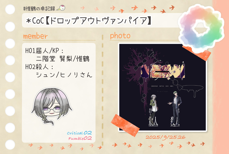 惟鶴(いづる)☆quiet followDONE*CoC【ドロップアウトヴァンパイア】HO1届人/KP:二階堂 賢梨/惟鶴HO2殺人:シュン/ヒノリさん #惟鶴の卓記録 show all(+2 images) Tap to full screen (size:1764x1185).Repost is prohibited Let's send reactions! freqpopularsnackothersPayment processing Replies from the creator Follow creator you care about!☆quiet follow 惟鶴(いづる)DONE*---*---*---*---*---*---*---*---*---* Happy Birthday 9月生まれの子たち*---*---*---*---*---*---*---*---*---* 惟鶴(いづる)DONE*CoC【灰と甘露】KP:ななさんHO1×稲荷空狐:瀬田 彩華/雪鶴花さんHO2×七歩蛇:八雲 澪/惟鶴HO3×獏:柳 容二/手袋さんHO4×橋姫:一条 桃椛/MayuさんHO5×絡新婦:細蟹 契/めいそうさんHO6×蝶化身:麓山 珠莉/ももさん 5 惟鶴(いづる)DONE*CoC【ドロップアウトヴァンパイア】HO1届人/KP:二階堂 賢梨/惟鶴HO2殺人:シュン/ヒノリさん 3 惟鶴(いづる)DONE*CoC【傘月堂夜話】 2025.9.22-23第伍話『桜隠し』エピローグ『桜の下の満開の宴』KP:惟鶴PC/PL華学 永真/にゃんべぇさん李 颯懍/ひなたさん東条 菖蒲/すてあさん蜻蛉 千琴/かいさん 4 惟鶴(いづる)DONE*CoC【Karmφ -カルマ-】KP:矢野さんPC/PL茜谷 燐火/彼方 怜異さん志摩 香蓮/peace_faceさん須夜崎 泉成/惟鶴南野 風歌/しずくさん 2 惟鶴(いづる)DONE*CoC【とかく幼児化したKPCが探索者を困らせる話】KPC/KP:四ノ槻 彗晴/惟鶴PC/PL:琴宮 海凪/ひなたさん 3 related works 惟鶴(いづる)DONE*CoC【理不尽sermarie】KPC/KP白椿翠鳥/久遠さんPC/PL真鴨祥午/惟鶴 2 惟鶴(いづる)DONE*CoC【Good night,Judas.】KP:ららうさぎさんHO1:掛井紳司/ぽるかさんHO2:戌亥文聡/彼方怜異さんHO3:須賀烈斗/asatoさんHO4:雨倉燕時/惟鶴 3 惟鶴(いづる)DONE* CoC【間も無く、最終電車が参ります。】KP:惟鶴PC/PL:寒鳥 皇/カシスナッツさん矢野川憶李/昇天さん宇治 京梧/shuuuさん 2 惟鶴(いづる)DONECoC【大正グロテスキズム】KP:惟鶴PC1精神科医:芥子奈 右近/asatoさんPC2小説家:東雲 吟/彼方怜異さん 2 惟鶴(いづる)DONE*CoC【犬猫戦争は、終わらせない。】KP:惟鶴HO1犬:狛犬 一之助/水煙さんHO2猫:南古屋 猫央/ひなたさん 2 惟鶴(いづる)DONE*CoC【Joker≒Joker】KP:シーナさんHO♤:ブルーバード/ジョリさんHO♡:ハーネット/ひなたさんHO♢:リラ/惟鶴HO♧:レングマン/鹿猫さん 3 惟鶴(いづる)DONE*CoC【グランドグラビティ】KP:久遠さんPC/PL歌騙己己尽/夜杜さん棗 由良/ひすいさん十司 真木/惟鶴 2 惟鶴(いづる)DONE*CoC【ARCANA】KP:昇天さん SKP:shuuuさん HO1:グリム/カナタさん HO2:コランダム/うみ牛。さん HO3:ギル /memoさん HO4:ラズ/惟鶴 4 惟鶴(いづる)DONE*CoC【奇奇怪怪同好会 chapter1心霊プリ】KPC/KP姫月 結縁/久遠さんPC/PL六條 葵/惟鶴神為ヰ鎖無/夜杜さん 2 recommended works 惟鶴(いづる)DONE*---*---*---*---*---*---*---*---*---* Happy Birthday 5月生まれの子たち*---*---*---*---*---*---*---*---*---* ゆりげDOODLE愛犬の散歩中 かおりDONEリクエスト シャンエロ絵 クタペン触手 wawako_005DONE✦ ᴅɪꜱᴘʟᴀʏ ✦ネタバレなし 2 screamwandererPROGRESS MelosDOODLEmanao中也女体化本 7 薄目で見てDOODLE学生のぶぜ まちばちゃMEMO天使ちゃん6️⃣完成! 7 深春(みはる)DONEだんごむしさんとかつてお話してたmtmt夢です。 3