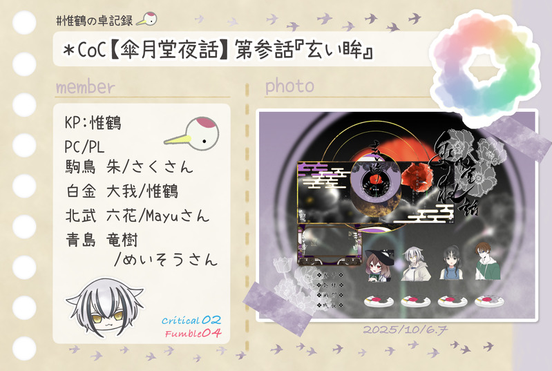 惟鶴(いづる)☆quiet followDONE*CoC【傘月堂夜話】第参話『玄い眸』KP:惟鶴PC/PL駒鳥 朱/さくさん白金 大我/惟鶴北武 六花/Mayuさん青島 竜樹/めいそうさん #惟鶴の卓記録 show all(+1 images) Tap to full screen (size:1764x1185).Repost is prohibited Let's send reactions! freqpopularsnackothersPayment processing Replies from the creator Follow creator you care about!☆quiet follow 惟鶴(いづる)DONE*CoC【奇奇怪怪同好会 chapter2 幽霊映画館】KPC/KP姫月 結縁/久遠さんPC/PL六條 葵/惟鶴神為ヰ鎖無/夜杜さん 2 惟鶴(いづる)DONE*CoC【傘月堂夜話】第参話『玄い眸』KP:惟鶴PC/PL駒鳥 朱/さくさん白金 大我/惟鶴北武 六花/Mayuさん青島 竜樹/めいそうさん 2 惟鶴(いづる)DONE*---*---*---*---*---*---*---*---*---* Happy Birthday 9月生まれの子たち*---*---*---*---*---*---*---*---*---* 惟鶴(いづる)DONE*CoC【灰と甘露】KP:ななさんHO1×稲荷空狐:瀬田 彩華/雪鶴花さんHO2×七歩蛇:八雲 澪/惟鶴HO3×獏:柳 容二/手袋さんHO4×橋姫:一条 桃椛/MayuさんHO5×絡新婦:細蟹 契/めいそうさんHO6×蝶化身:麓山 珠莉/ももさん 5 惟鶴(いづる)DONE*CoC【ドロップアウトヴァンパイア】HO1届人/KP:二階堂 賢梨/惟鶴HO2殺人:シュン/ヒノリさん 3 惟鶴(いづる)DONE*CoC【傘月堂夜話】 2025.9.22-23第伍話『桜隠し』エピローグ『桜の下の満開の宴』KP:惟鶴PC/PL華学 永真/にゃんべぇさん李 颯懍/ひなたさん東条 菖蒲/すてあさん蜻蛉 千琴/かいさん 4 related works 惟鶴(いづる)DONE*CoC【Joker≒Joker】KP:シーナさんHO♤:ブルーバード/ジョリさんHO♡:ハーネット/ひなたさんHO♢:リラ/惟鶴HO♧:レングマン/鹿猫さん 3 惟鶴(いづる)DONE*CoC【グランドグラビティ】KP:久遠さんPC/PL歌騙己己尽/夜杜さん棗 由良/ひすいさん十司 真木/惟鶴 2 惟鶴(いづる)DONE*CoC【犬猫戦争は、終わらせない。】KP:惟鶴HO1犬:狛犬 一之助/水煙さんHO2猫:南古屋 猫央/ひなたさん 2 惟鶴(いづる)DONE* CoC【間も無く、最終電車が参ります。】KP:惟鶴PC/PL:寒鳥 皇/カシスナッツさん矢野川憶李/昇天さん宇治 京梧/shuuuさん 2 惟鶴(いづる)DONE*CoC【Good night,Judas.】KP:ららうさぎさんHO1:掛井紳司/ぽるかさんHO2:戌亥文聡/彼方怜異さんHO3:須賀烈斗/asatoさんHO4:雨倉燕時/惟鶴 3 惟鶴(いづる)DONE*CoC【理不尽sermarie】KPC/KP白椿翠鳥/久遠さんPC/PL真鴨祥午/惟鶴 2 惟鶴(いづる)DONE*CoC【奇奇怪怪同好会 chapter1心霊プリ】KPC/KP姫月 結縁/久遠さんPC/PL六條 葵/惟鶴神為ヰ鎖無/夜杜さん 2 惟鶴(いづる)DONE*CoC【奇奇怪怪同好会 chapter2 幽霊映画館】KPC/KP姫月 結縁/久遠さんPC/PL六條 葵/惟鶴神為ヰ鎖無/夜杜さん 2 惟鶴(いづる)DONECoC【大正グロテスキズム】KP:惟鶴PC1精神科医:芥子奈 右近/asatoさんPC2小説家:東雲 吟/彼方怜異さん 2 recommended works あべっちMEMOそういう事なんじゃねえのと思ったら止められなかったゼンゼロ ライト受け 135 ameshituPASTTwitterで上げてた銀河等まとめました。最近投稿出来てないから…せっかくなのでポイピクの方に上げさせてもらいます🙏 15 marusukenoTRPGDOODLEディスコ🕺には先に出しておりましたがTLに放流するのをすっかり寝こけて忘れておりましたわテイクアウトドリンクにメッセージ書くうちの夏☀️ボーイです sasaminosousakuDONE蛾と踊る疾風迅雷の刃牙(ラトゥール(近藤愛衣))全差分 10 ktn.DONEネコとカラスの休戦日、イベント開催おめでとうございます!!!遅くなってしまいましたがネップリ登録しました!画像がポストカードサイズなので、印刷時に端が切れるか余るかもしれません…!すみません!また近いうち(年内〜年明けあたり)にネップリを予定していますので、機会がありましたらよろしくお願いします!イベント開催期間、素敵な時間をお過ごしください〜〜!2枚目はQRコード 2 CubozoaDOODLE ァュ(59右)PAST飯空 るしこDOODLE ツカダMEMO待って❤️80p超えてる❤️内容としては未成立パーバソが白い部屋にぶちこまれて脱出を目指す話です。エロは一部存在する。