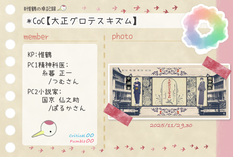 惟鶴(いづる)☆quiet followDONE*CoC【大正グロテスキズム】KP:惟鶴PC1精神科医:糸暮 正一/つむさんPC2小説家:国京 仙之助/ぽるかさん #惟鶴の卓記録 show all(+1 images) Tap to full screen (size:1764x1185).Repost is prohibited Let's send reactions! freqpopularsnackothersPayment processing Replies from the creator Follow creator you care about!☆quiet follow 惟鶴(いづる)DONE*CoC【三魂の契りをもって器とする】KP:ひなたさんHO1草薙剣:土井 ヤマト/すてあさんHO2八尺瓊勾玉:土岐 ミツキ/くるみさんHO3八咫鏡:弥里 キョウ/惟鶴 3 惟鶴(いづる)DONE*CoC【大正グロテスキズム】KP:惟鶴PC1精神科医:糸暮 正一/つむさんPC2小説家:国京 仙之助/ぽるかさん 2 惟鶴(いづる)DONE*---*---*---*---*---*---*---*---*---* Happy Birthday 11月生まれの子たち*---*---*---*---*---*---*---*---*---* 惟鶴(いづる)DONE*CoC【傘月堂夜話】第肆話『奈落の青』KP:惟鶴PC/PL駒鳥 朱/さくさん白金 大我/惟鶴北武 六花/Mayuさん青島 竜樹/めいそうさん 2 惟鶴(いづる)DONE*ガイアケア【霧中復讐鬼談】DL:惟鶴HO1人間:剛山 柔和/にゃんべぇさんHO2融人:ハツ/くるみさん 2 惟鶴(いづる)DONE*CoC【辜月のN】KP:惟鶴PC1禍:山上 美羊/木口さんPC2箱:犬飼 哲之介/うおさん 2 related works 惟鶴(いづる)DONE*CoC【グランドグラビティ】KP:久遠さんPC/PL歌騙己己尽/夜杜さん棗 由良/ひすいさん十司 真木/惟鶴 2 惟鶴(いづる)DONECoC【大正グロテスキズム】KP:惟鶴PC1精神科医:芥子奈 右近/asatoさんPC2小説家:東雲 吟/彼方怜異さん 2 惟鶴(いづる)DONE*CoC【犬猫戦争は、終わらせない。】KP:惟鶴HO1犬:狛犬 一之助/水煙さんHO2猫:南古屋 猫央/ひなたさん 2 惟鶴(いづる)DONE*CoC【奇奇怪怪同好会 chapter1心霊プリ】KPC/KP姫月 結縁/久遠さんPC/PL六條 葵/惟鶴神為ヰ鎖無/夜杜さん 2 惟鶴(いづる)DONE*CoC【傘月堂夜話】第肆話『奈落の青』KP:惟鶴PC/PL駒鳥 朱/さくさん白金 大我/惟鶴北武 六花/Mayuさん青島 竜樹/めいそうさん 2 惟鶴(いづる)DONE*CoC【理不尽sermarie】KPC/KP白椿翠鳥/久遠さんPC/PL真鴨祥午/惟鶴 2 惟鶴(いづる)DONE* CoC【間も無く、最終電車が参ります。】KP:惟鶴PC/PL:寒鳥 皇/カシスナッツさん矢野川憶李/昇天さん宇治 京梧/shuuuさん 2 惟鶴(いづる)DONE*CoC【奇奇怪怪同好会 chapter2 幽霊映画館】KPC/KP姫月 結縁/久遠さんPC/PL六條 葵/惟鶴神為ヰ鎖無/夜杜さん 2 惟鶴(いづる)DONE*CoC【Joker≒Joker】KP:シーナさんHO♤:ブルーバード/ジョリさんHO♡:ハーネット/ひなたさんHO♢:リラ/惟鶴HO♧:レングマン/鹿猫さん 3