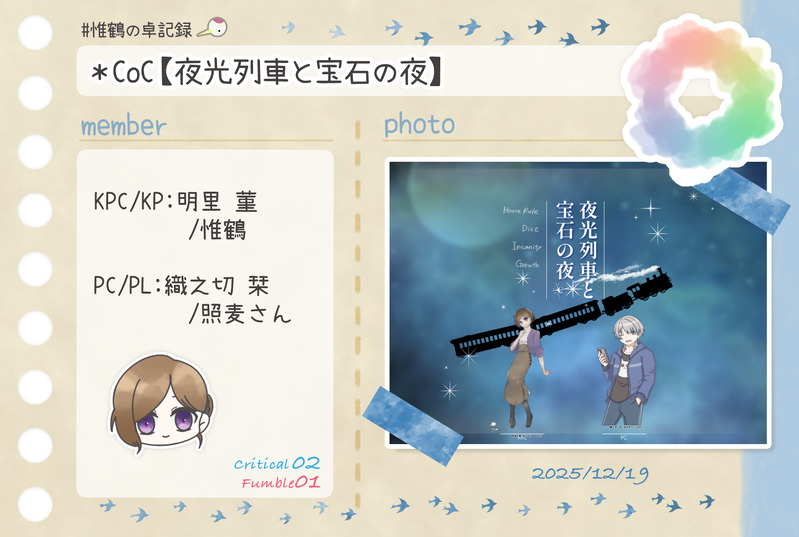惟鶴(いづる)☆quiet followDONE*CoC【夜光列車と宝石の夜】KPC/KP:明里 菫/惟鶴PC/PL:織之切 栞/照麦さん #惟鶴の卓記録 show all(+1 images) Tap to full screen (size:1764x1185).Repost is prohibited Let's send reactions! freqpopularsnackothersPayment processing Replies from the creator Follow creator you care about!☆quiet follow 惟鶴(いづる)DONE*エモクロア【Hello new world.】DL:カナタさんPC/ PL:ラズ/惟鶴 2 惟鶴(いづる)DONE*CoC 【たのしくおいしい桃ビュッフェにようこそ!】PC/PL香月 大華/さくさん南條 和泉/チョコさん斎藤 雅人/ひすいさんKPC/KP桂城 朧/惟鶴 2 惟鶴(いづる)DOODLE*2026自探索者おみくじ*自探索者で1d100おみくじ※ロストした子も含む結果:113人中5C6F 13 惟鶴(いづる)DONE🐴🎍Happy new year 2026🎍🐴character:真鴨祥午 惟鶴(いづる)INFO*自作ココフォリアログ解析ツール説明・CoC6版用・クリティカル・ファンブル等の回数をキャラ・技能ごとにカウントするもの 惟鶴(いづる)DONE*CoC【さいごのパーガトリ】KPレス松百 五十鈴/惟鶴 3 related works 惟鶴(いづる)DONE*CoC【傘月堂夜話】第肆話『奈落の青』KP:惟鶴PC/PL駒鳥 朱/さくさん白金 大我/惟鶴北武 六花/Mayuさん青島 竜樹/めいそうさん 2 惟鶴(いづる)DONE*CoC【奇奇怪怪同好会 chapter2 幽霊映画館】KPC/KP姫月 結縁/久遠さんPC/PL六條 葵/惟鶴神為ヰ鎖無/夜杜さん 2 惟鶴(いづる)DONE* CoC【間も無く、最終電車が参ります。】KP:惟鶴PC/PL:寒鳥 皇/カシスナッツさん矢野川憶李/昇天さん宇治 京梧/shuuuさん 2 惟鶴(いづる)DONE*CoC【犬猫戦争は、終わらせない。】KP:惟鶴HO1犬:狛犬 一之助/水煙さんHO2猫:南古屋 猫央/ひなたさん 2 惟鶴(いづる)DONE*CoC【奇奇怪怪同好会 chapter1心霊プリ】KPC/KP姫月 結縁/久遠さんPC/PL六條 葵/惟鶴神為ヰ鎖無/夜杜さん 2 惟鶴(いづる)DONECoC【大正グロテスキズム】KP:惟鶴PC1精神科医:芥子奈 右近/asatoさんPC2小説家:東雲 吟/彼方怜異さん 2 惟鶴(いづる)DONE*CoC【グランドグラビティ】KP:久遠さんPC/PL歌騙己己尽/夜杜さん棗 由良/ひすいさん十司 真木/惟鶴 2 惟鶴(いづる)DONE*CoC【理不尽sermarie】KPC/KP白椿翠鳥/久遠さんPC/PL真鴨祥午/惟鶴 2 惟鶴(いづる)DONE*CoC【Joker≒Joker】KP:シーナさんHO♤:ブルーバード/ジョリさんHO♡:ハーネット/ひなたさんHO♢:リラ/惟鶴HO♧:レングマン/鹿猫さん 3 recommended works S26qfDOODLE近期的一些 8 ereplyDONEブラーのおセンシティブまとめです。二枚だけブロキャもあるよ!ほぼ2010。リバースとLGが一枚ずつ。モブ姦と触手です。お好きな方は楽しんで行ってね♡ 12 ぺんすけMOURNINGプルガトリウムの夜 HO1🔫酉水 鵐 立ち絵+αです!プルガトリウムの夜 現行未通過❌🔑通過/読了済みですか?→y/n1枚目のディスプレイはアルトより🦇 16 min_clover_OPPASTルサンの過去絵です君サン3開催ありがとうございます!!なんかいかがわしいものも含まれていますのでご注意ください。 46 panpanpanda35PAST【!!閲覧注意!!】北虎先輩の彼女さんのアクリルスタンド作成用のCP絵です。彼女さんから色々といただき物があったのでそのお返しに描きました。同担拒否の方は閲覧非推奨です!! ickyDONE(lingerie) kon kon! 2 栗饅頭DOODLESPECパロっぷさんとさんぼ 3 shibe362DOODLE30周年めでたい!! あめむDOODLE四季送り げんみ❌自陣⭕️曲パロ動かしたい 14
