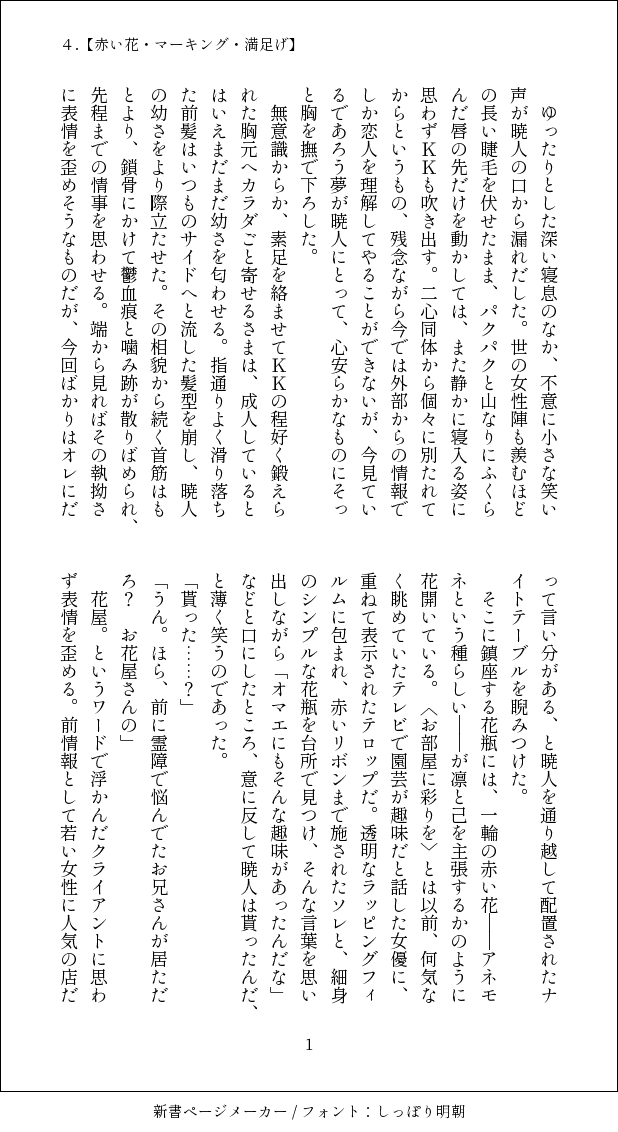 085☆quiet followTRAINING4.【赤い花・マーキング・満足げ】ストーリーがメインになってしまったので、コチラへ。花に嫉妬するKの話。 #K暁 show all(+3 images) Tap to full screen (size:618x1132).Repost is prohibited 085MEMOカラ主♂で諸々吐き出していたもののlog 4797 085TRAININGR6.9/25のけあきデーのお題【秋限定】を意識して。秋限定ならぬ、″あき″限定のお話。またの名を『オマエは居てもいい』な話。 4 085MEMOタイツにてむつむつと呟いていたネタツイ。※ttr屋は捏造の塊です※祟→暁の香り含みます 3 085DOODLE「早急に全員に伝えて。休憩よ」 2 085TRAININGR6.8/25に参加したけあきデーの話。お題は【秋の気配】をお借りしてました。 5 085TRAININGKの口数が少ない話。 4 related works 32honeymoonMOURNING・マンネリ防止のために少しだけ変わり種。K暁。痩男が名前だけ登場します・二心同体軸ですがご都合主義でKKが体を得てます・ゲーム内時間で言うと5章の終わりくらいの時間軸・暁→K、K→暁の両片想い、とみせかけた完全両想い・最初やや無理強い表現はありますが基本的には愛し合ってます!最後中出し表現あります苦手な方はご無理なさらずそっ閉じで。PASS→20歳以上ですか?英語3文字でどうぞ。 7478 アカリMEMOアップしたK暁(🦊)の小ネタと🦊暁くんの絵です。 2 鯖目ノスDONEゴスハンK暁小説エピローグ編です長々とお付き合いありがとうございました。これにて完結です。K暁といいつつもおじさんのクソデカ感情が露呈しただけですが将来的にK暁になる予定だからオッケー(?) 9522 時人歩DONEこのCPで書くのは初めてなので初投稿です。こんな処女作で大丈夫か。まだゲーム完走してないんですけど、これはここ逃がすと一年後になってしまうのでフライングで失礼します……!K暁です・3・ 2124 吉冬⛩DONE #毎月25日はK暁デーお題:彼岸花、徒競走けけおじの色んな面が好きなあきとくんの話。名有りのモブ依頼人が登場します。 7 ウジムシ蛾DONEちょっと書いたのでのせてみます。K暁。 3704 na2me84DOODLE140文字がたまったので纏めました。 21 _hinon_CAN’T MAKEKKおじさんの匂いに酔っぱらう猫暁人くんのお話(猫パロ)K暁 337 085TRAINING #毎月25日はK暁デー より『ジューンブライド』 6 recommended works みらいDONE腐女子の麻里ちゃんと絵梨佳ちゃんがK←暁で萌える話。腐女子表現苦手な人は回れ右。苦情は受け付けておりません!ちゃんと、K暁です。続き→https://poipiku.com/5178582/6937443.html 1964 takeke_919DOODLE #妖怪コロッケおじさん #gwtonly2022二日目のコロッケはソース掛けてから冷蔵庫で冷やして食べます✌︎('ω'✌︎ ) 1210 祟久⛩️-Suiku-DONEK暁でちゅーが描きたかっただけの謎シチュエーション🤔 もちこの本棚📖DOODLE暁人くん、ゲリラ豪雨が嫌すぎて常に折り畳み傘持ってるかもな~と書き終わってから思ったのはここだけの話です 804 はるしかDONE京関いちゃいちゃ「見惚れる」おてて編 3 POI9427323DOODLE【鸣佐】【あす】TRAP! 25 yukueDOODLEネロ晶♀チアコス 2 もちこの本棚📖PASTK暁140字SSまとめです、前回の秋祭以降に書いたものになります✍️ 14 nachi_osoraDONEK暁デー参加作品。お題は「秋限定」で、なちゅらるに一緒に暮らしてる系師弟。しっかり出来上がってます。ずるくてだめなおじさんと、ほだされて許しちゃう食いしん坊あきとくんの話。私にしてはイチャイチャしてるのでは?では??!! 3635