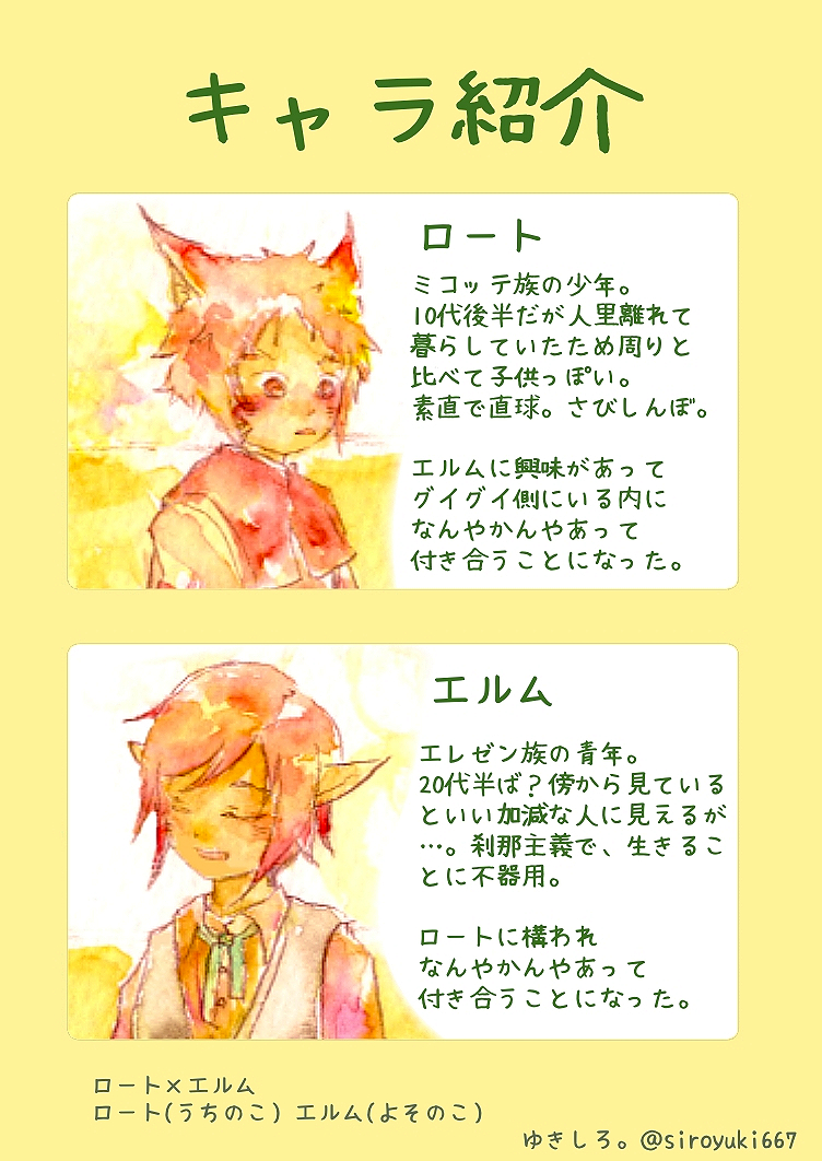 ミコエレ(男×男)のイラストです。全年齢。うちの子 ミコッテ男子(ロート)と、よその子 エレゼン男性(エルム)のイラスト。2025年頃分。