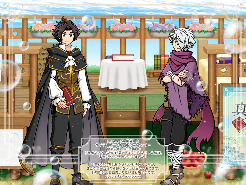 2024/9/15に『真実の書と自由の鍵』を開催し、1年経って改めて感謝の気持ちをお伝えしたくて描いたものです。運営本部店舗の前で記念撮影のようなものをしている二人、のつもり。本当にありがとうございました!