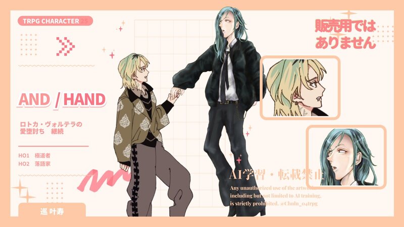 okakitaku☆quiet followDONE「ロトカ・ヴォルテラの愛堕討ち」継続▶︎「AND/HAND」巡 叶寿/刈茅 隆史併せ立ち絵でした!ディスプレイも作っていただけましたありがてえ…頭上がらないです…ロトあだ自陣もっとなんか…なんか…しな!!遊びな!!ついでに生えた落語家の表情差分も載せておきます show all(+1 images) Tap to full screen (size:1280x720).Repost is prohibited Let's send reactions! freqpopularsnackothersPayment processing Replies from the creator Follow creator you care about!☆quiet follow okakitakuSPOILERCoC【僕らに夜明けはやってこない】- 両生還KP/KPC:花華糖さん/獅子黄 紫詩子PL/PC:オストリカ/アシュレイ モリス「なんやあ、ポロポロでスクランブルエッグになっとるやないか」同空継続嬉しい〜〜 やった〜! okakitakuSPOILERCoC【ある作家の首水槽】- エンド3HO1/作家:綴木 サラ|オストリカHO2/誘拐犯:ライト|えだまめさん(KP)「眩しすぎるな、よくそんなこと恥ずかしげもなく言えるね?」やった〜楽しかった〜嬉しいねこれね〜この二人おもろいな味するからまたみたいねこれね〜 2 okakitakuDONECoC「ある作家の首水槽」HO1-作家:綴木サラぶにぶにファンタジー作家で行くど‼️ okakitakuSPOILERK課1話現行未通過❌好色ワイ語録まとめ一個だけ他のPLの方の発言もありますシンクロしてておもろだったので okakitakuSPOILER𝘾𝙤𝘾【K県K課-第1話「増える男」】▼エンドA𝗞𝗣:ばぶくらげさん𝗛𝗢法螺吹き:睦 ソラ/ハジノメさん𝗛𝗢好色:根手 宵人/🦪𝗛𝗢守銭奴:道銭 六/ハコさん𝗛𝗢無能:蓑牟田 魁那/明舞さん「大丈夫、僕に全て委ねてくれれば良いですからねぇ」1話無事にクリア!次どうなるんやカスということしかわかってないぜ okakitakuSPOILERK課0話(現行未通過❌)好色語録秘匿の発言はないですアレな発言する時は逐一確認はしております recommended works @キュマ/小熊奈津DONE【エイダ・アップルビー(Ada Appleby)】JOKER≒JOKERの探索者です。 2 だけんSPOILER⚠️B’ASH 現行/未通過❌B’ASH日本支部伏せったーのネタ落書き前略、犬を拾ってきた。 sho_iaiaSPOILERソプスクを回してくれたKPとSKP、一緒に回ってくれたPLたち、沢山見学に来てくれた子たちに感謝を込めて描きました!※ネタバレの可能性あるためワンクッション matrymadamisuDONE刹夏 立ち絵 バストアップ夏乃 海良(なつの あまら) 2 xxx0syo0xxxDOODLEこれは安曇玲央の〇〇〇のすがたですがそぷすく・・・(VOIDのネタバレ自粛ワンクッション) 2 @キュマ/小熊奈津DOODLE【桐坂悠斗】熱情含有チョコレートのKPC 2 ☠️🍄☠️DOODLE若………干CP臭のするアナログ落書き🔥☔️&🐶💊相方を勝手に使った挙句クソ汚いし本当に酷い二次創作です 11 .*・゚銀華.゚・*.INFO卓報告ですCoC【愛罠蜂】KP:銀華PL/PCHO1:まゆげさん/御伽 翔HO2:ましまろっぴさん/津里 和子END_愛人には人の愛罠蜂だったなぁって思いました!!!また新しい世界見れて感無量だ〜!!ほんとにわなびって良いと実感させられる素敵なセッションでした〜私のところで通ってくれてありがとう〜!!!愛してる!! yyzcoconutDOODLEAgni x Soma啊啊啊啊啊啊啊我不会画画。。。。。说是アグソマ但其实三张都只有索玛对不起对不起即使在poipiku也不好意思放不打码的图,主要是我画几把画的太烂了。。。 7