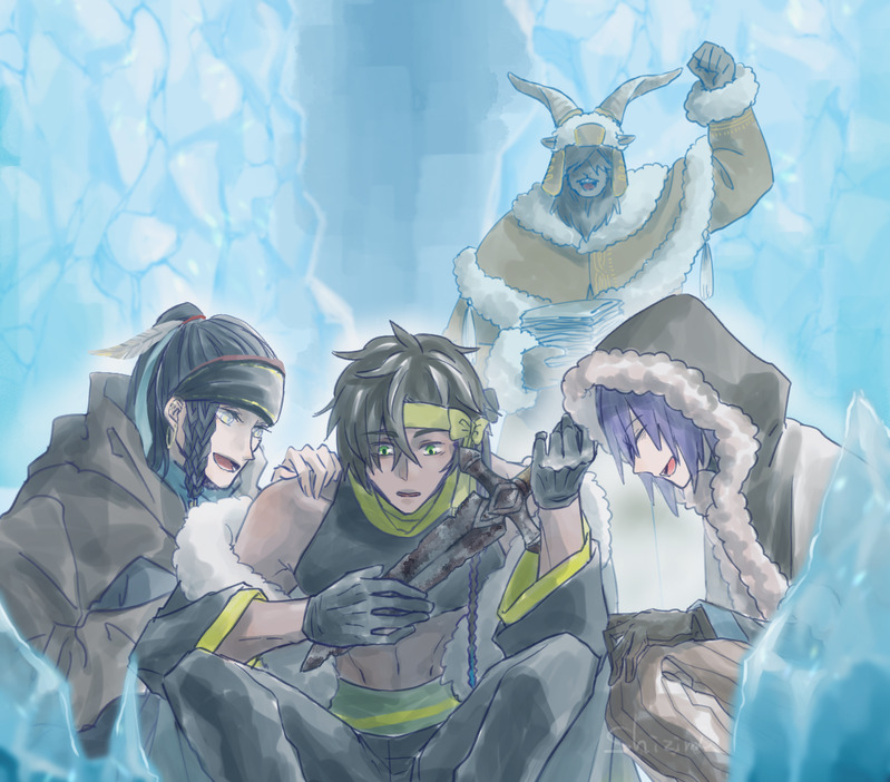 アスワド君が見つけた錆びた剣を見にやって来るユハさんとアルビレオと、お前ら真面目に探してねぇな!?のヨルグさん。(訳:3人それぞれダイスロールして全く同じ数字を叩き出すミラクル)