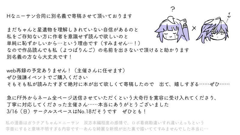 よつば☆quiet followDOODLE Tap to full screen (size:1600x900).Repost is prohibited Let's send reactions! freqpopularsnackothersPayment processing Replies from the creator Follow creator you care about!☆quiet follow よつばDOODLE強謙イベント申し込んでみようかな(行けたら行こうかな)とチマチマ描いてたら普通に脱落しました!次回改めてチャレンジしてみたい……!これは没サクカです よつばDOODLE※CP こういうガラ→ニンとラク→スミ本が……読みたい…… よつばPROGRESSメイド服シリーズ再開予定です かなり遅くなってしまいすみません……! よつばPROGRESS原稿終わったので落書き漫画を描くぞ と描き始めたんですがカードゲームのキャラって作画コスト高すぎて落書きにならない よつばDOODLE【創作】ハッピーハロウィン!今年もTRPGでつくったキャラたちです よつばPROGRESSできたらできます(頭痛が痛い) recommended works おとなのぺぺDOODLE※注意※触手・女体化・R18]原稿が頭つかうフェーズに入ったので休憩でなんも考えないらくがきをしましたクソクソ落書きなので期待しないでください iris_ulvDONE #1d100で決めた赤面度でリプ来た探索者を描く72赤面の光明盧黒くんに下の名前呼ばれた時の光明ですね 3 tori_play_gameDOODLE #1d100で決めた赤面度でリプ来た探索者を描くトウマ、雪華ちゃん、鳩羽さん、鶴見さん、イガシュでした!指名ありがとうございました✨ よつばDOODLE #1d100で決めた赤面度でリプ来た探索者を描く低い順からシャルルくん、架純さん、雁金くん、遙くんでした!ありがとうございました! よつばDOODLE「見る」が語源のアイドルならば、「見て見ぬふり」はできないよねー #ぼかます よつばArtSummary2022初詣はちゃんと行ったしちゃんと起きました you110116DOODLE #1d100で決めた赤面度でリプ来た探索者を描く 微調整・まとめ/4枚目はシチュの答え※アイラスのネタバレ有ります/みんな付き合ってくれてありがとう!楽しかった~~~~~~~~。 4 よつばDOODLE【APP18組】結局描いたバニーネタ よつばDOODLE #てづくりの39カウントダウン