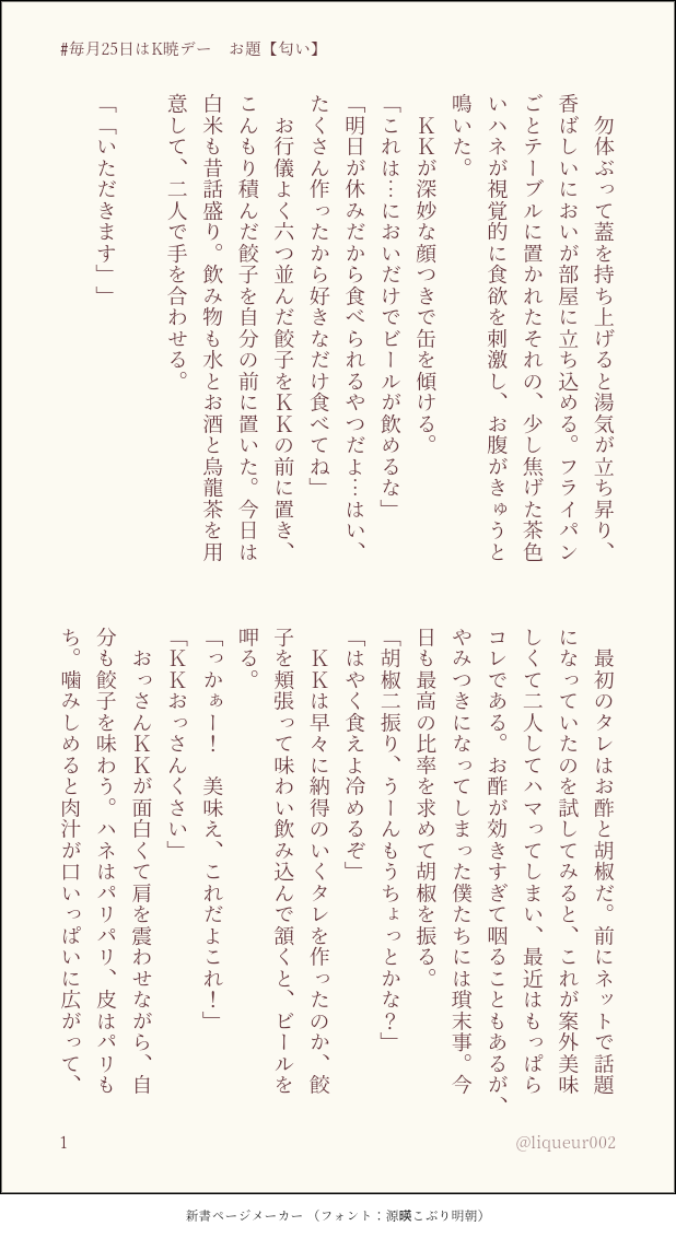 リキュール☆quiet followDONE #毎月25日はK暁デーお題【匂い】素敵な企画に参加させていただきました!二人には美味しいもの食べて、食の趣味合うとか合わないとか言い合って楽しく暮らしてほしい。相も変わらずKK生存IFです。 #K暁 #毎月25日はK暁デー show all(+3 images) Tap to full screen (size:618x1132).Repost is prohibited Let's send reactions! freqpopularsnackothersPayment processing Replies from the creator Follow creator you care about!☆quiet follow リキュールDONE『あの夜から、四年』開催おめでとうございます!高速道路で線状降水帯を車で突っ切るK暁です。ライド…自分が運転しない乗り物に乗ること。暁人に憑いたKK。パスワードの問題でポイピクで展示していますが、イベント終了後はこちらを非公開にし、くるっぷで公開予定です。 4159 リキュールDONE #毎月25日はK暁デー7月お題【宿題】を書かせていただきました。またも大大大遅刻。可愛いこと言い出すあきとくんとそんな可愛いやつを甘やかしちゃうけけの話。美味しいもの食べるあきとくん。生姜の辛味は何にでも合う気がする。 4984 リキュールDONE #毎月25日はK暁デー お題【雨のち晴れ】書かせていただきました!『天泣滴る窓辺にて』雨といえば狐の嫁入り。そしてあいも変わらず美味しいもの食べるけあきです!ちょっと祟り屋ネタがあります。 9 リキュールCAN’T MAKE暁人と祟り屋(便宜上、印、棒、弓呼び)のゲーム交流。捏造しかしてない。K暁匂わせ含む日常わちゃわちゃ系。男子学生同士みたいな会話する暁人くんと棒弓が見たかったんだ…。マスク?のまま珈琲が飲めるならご飯も食べられるだろ!と思ってるんですけどどうなんでしょうね? 3137 リキュールDONE #春のdskbけあき祭りちょっと過ぎましたけど使わせてください!例祭のスクショを元に、みつ様よりセリフやネタをいただきました。例祭の後のお狐暁人とKK、みつ様のK暁がいろいろあるお話です。もっとも簡潔に言うならば『夜通し耐久お仕置きえっち応援上映プレイ』です。18↑(Y/N) 8521 リキュールDONE #毎月25日はK暁デーお題【夢うつつ】参加させていただきました!美味しいもの食べるけあきです!タイトルをつけるなら『春眠暁を覚えず』。 7 related works 臓物(GwT)DONE #毎月25日はK暁デー9月のお題「彼岸花」で参加させていただきました!(※Twitterに上げていたものと同じ内容です) 6 柑橘🍊DONE9月のK暁デーでお題は「彼岸花」で書かせていただきました!個人的に彼岸花は好きです! 1646 吉冬⛩DONE #毎月25日はK暁デーお題:彼岸花、徒競走けけおじの色んな面が好きなあきとくんの話。名有りのモブ依頼人が登場します。 7 吉冬⛩DONE #毎月25日はK暁デーお題:ジューンブライド、ボーナス、願い事うちのけあきは過去を繰り返さないよう、お互いが自分の気持ちを伝える努力をちゃんとしてますよ、という話。 3 085TRAINING #毎月25日はK暁デー より『ジューンブライド』 6 subaccount3210DONE #毎月25日はK暁デー【秋雨】【ハッピーバースデー】【花火】2025年8月急に閃いて書いたので上手く書けていないかもしれないので雰囲気だけ読んでいただけたら幸いです。 1831 ことざきDONE24年5月の、#毎月25日はK暁デー に参加させていただきました。お題は『傘』『真夏日』『ネクタイ』。プレゼントしあうK暁です。 6413 pasono_riDONEK暁 #毎月25日はK暁デー 「願い事」「ジューンブライド」で失礼致します 2 subaccount3210DONE #毎月25日はK暁デー【ジューンブライド】【ボーナス】【願い事】※純度100%けあきです!!!※ナチュラルに全員生きています 2125 recommended works _hinon_CAN’T MAKE祓魔師なKKと落ちこぼれ淫魔な暁人くんR-18 K暁 淫魔パロ※暁人くん♡喘ぎしてるしKKも軽く喘いでるよ!!※書きたいところを書いてるので急に話が飛ぶし設定活かしきれてないよ!!pw/🏍️のナンバー 1430 みらいDONE※注意書き※本当にひどいし、キャラ崩壊、下品です。キャラ崩壊が苦手な方は回れ右してください。腐女子麻里ちゃんと絵梨佳ちゃんがK暁に強請る話前回の話から一年経ち、付き合っていると公言した後のお話だと思ってください!前→https://poipiku.com/5178582/6862362.html 1183 32honeymoonMENUジューンブライド小説、後編。初夜後から式を挙げるまでの話になります。直接的な描写はありませんが、凛子と恵梨佳、エドとデイルが恋仲のように書かれる部分があります。また、デイルの性格(セリフ)にある程度の捏造がありますのでその辺注意。 10747 _hinon_TRAININGKKおじさんの精◯を口移しするW暁人くんK暁 一応R-18にしとくpw/🏍️のナンバー _hinon_DONE事後K暁 彼シャツ的なものR-18じゃないけど露出ありなので一応「ぁ、煙草の匂い・・・これKKの服だ」pw/🏍️のナンバー 若草甚DONEロナドラ♀新刊サンプル 8 32honeymoonDONE<なんてことない日常のよろこびを>◇K暁。KK受肉してます。同棲してるふたり。◇なんだかひたすらに甘いです。あまあま苦手な方はご注意ください。◇某有名コーヒーショップのカスタムを参考にしてますが実在はしないかもしれません 7 _hinon_CAN’T MAKEスランプで顔が描けなくてリハビリK暁 